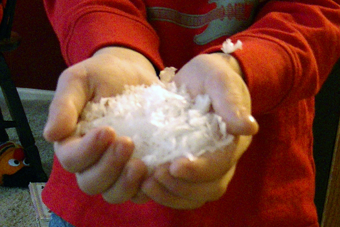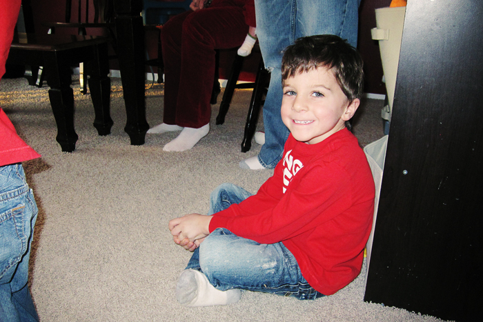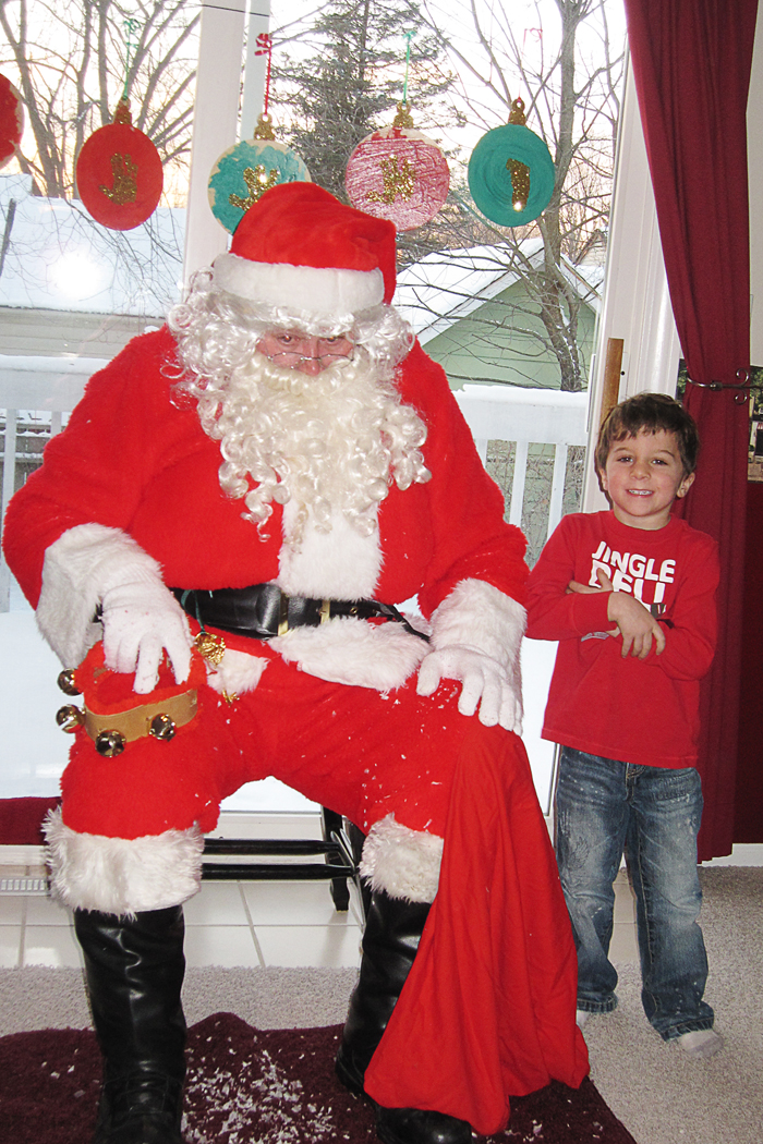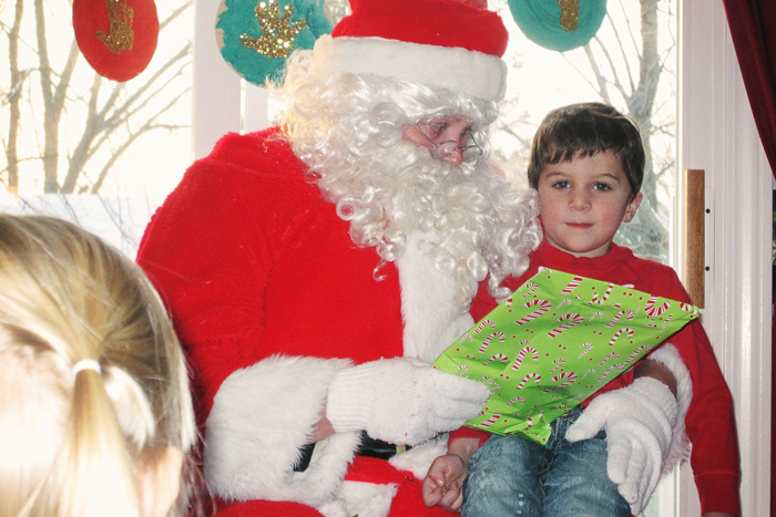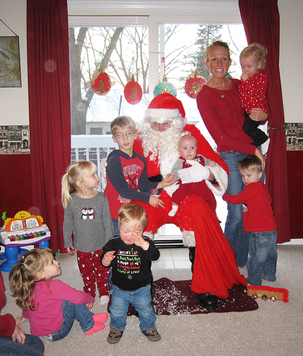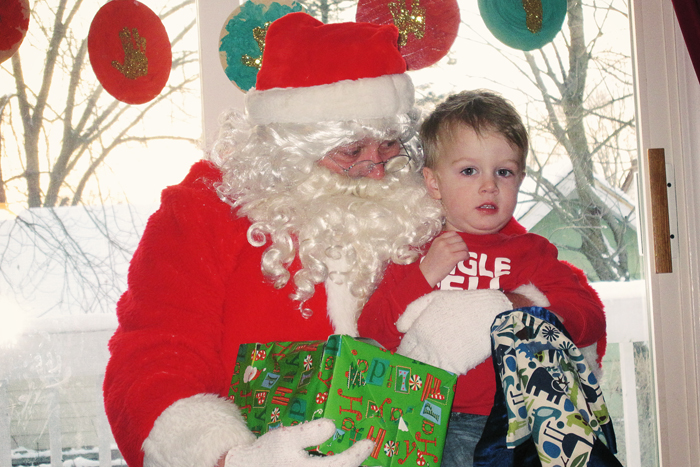 Every year, Santa Claus comes to Miss Marleen’s house to bring presents to her daycare kids (and their siblings). Since we began doing this, we don’t go see the “Mall Santa”. This guy is great! He’s loud and his HO HO HO’s boom through the house. He has jingle bells he shakes and magic snow he lets the kids throw up into the air. He does a wonderful job and is so good with the kids.