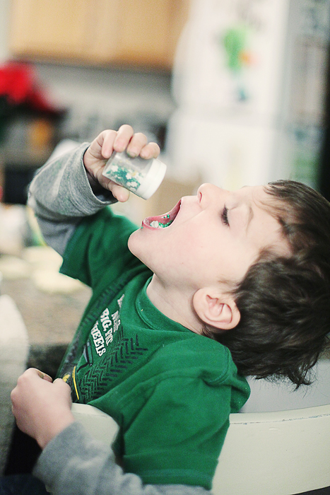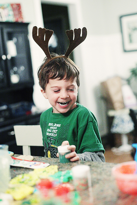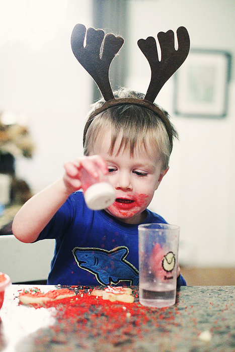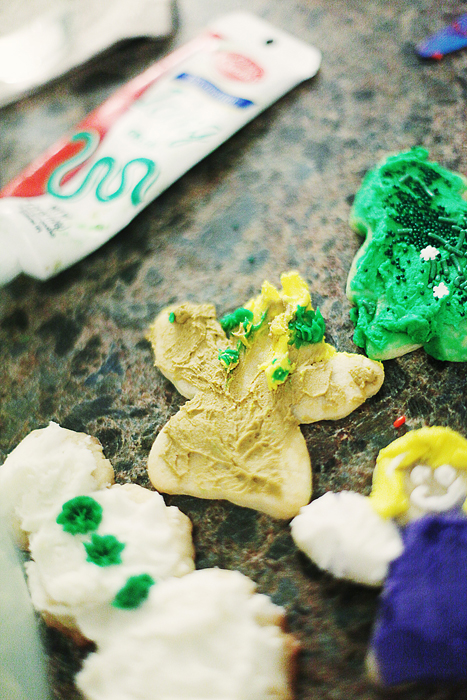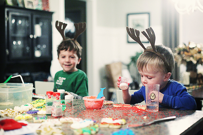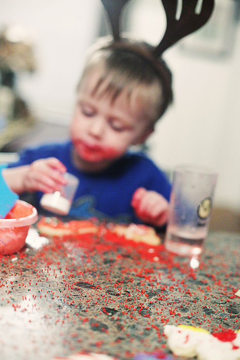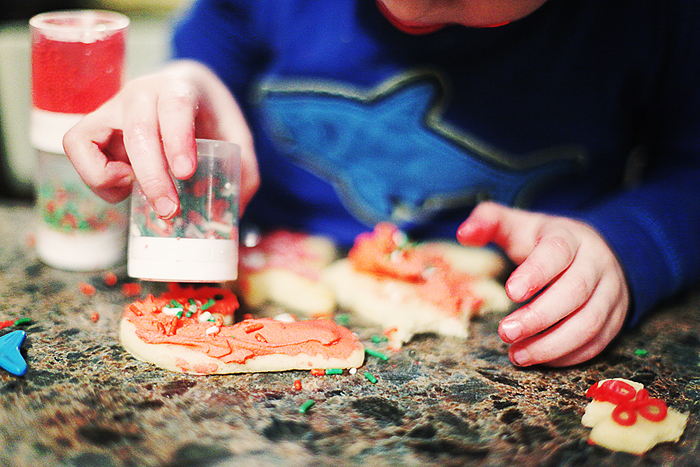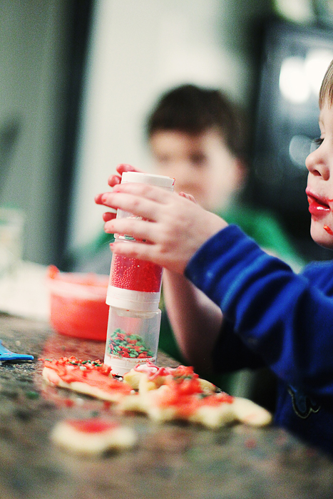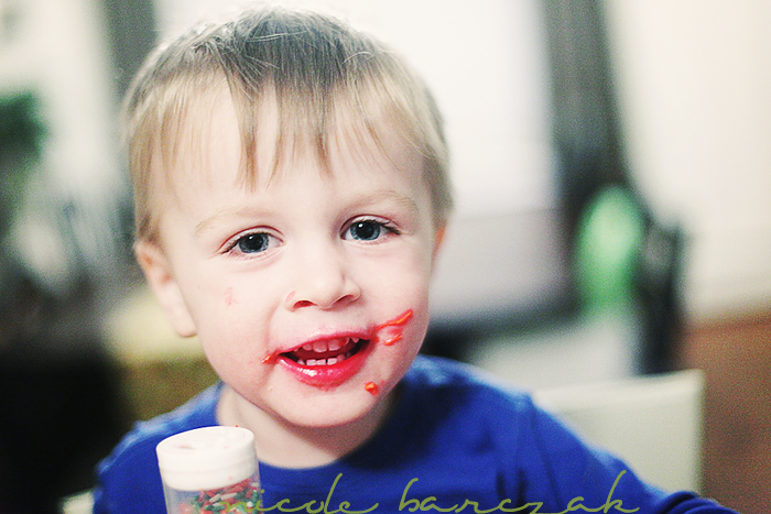 When it came time to decorate… oooh boy.  I kind of let them go to down and do whatever. They were having fun and it was keeping them entertained.  So what if Hudson dumped out two whole containers of sprinkles and Porter ate a majority of the green icing?  🙂