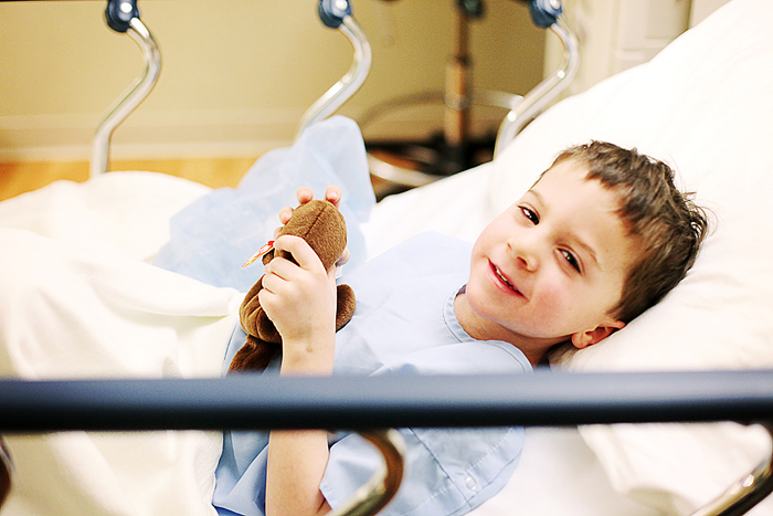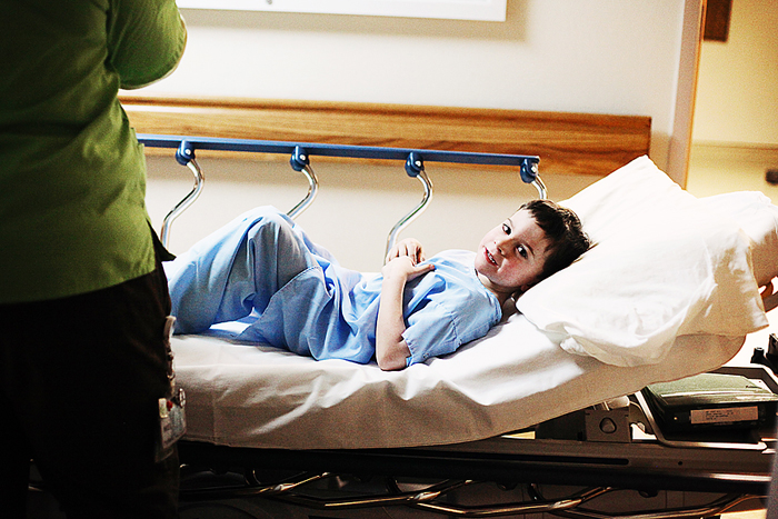 After his surgery, he came off the anesthetic in a terrible mood… hitting and trying to rip out his IV. I climbed into bed with him to try to calm him down. He finally settled down and the nurses brought him a popsicle (green, of course!). All was well in the world from that point on.