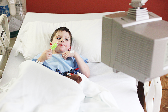 Back in the room, he seemed to recover in a snap. He was content munching cereal, eating numerous green popsicles and watching cartoons. We left the hospital at 11am (so strange to leave so soon after he’d had a procedure done!) and he was literally skipping and hopping out the doors. We kept reminding him he needed to walk and stay calm but he was just a bundle of energy! I can’t believe how resilient kids are. In the truck on the way home he told us “Just tell me to rock on with my bad self, Mom!” He sure makes us laugh!