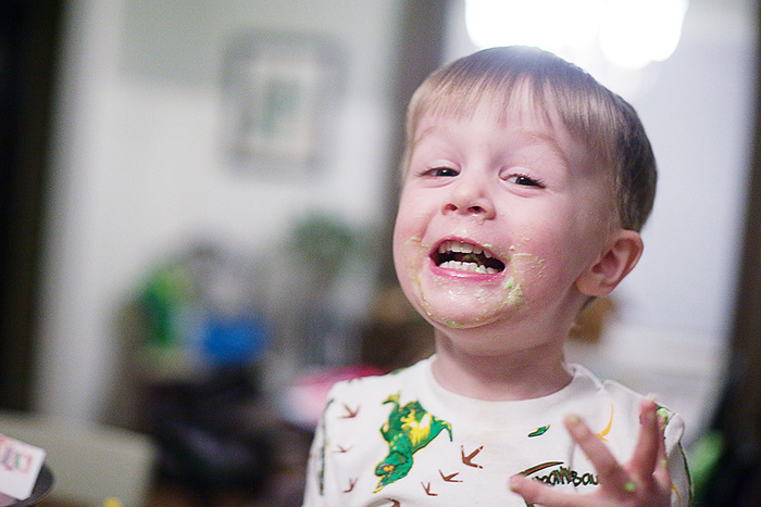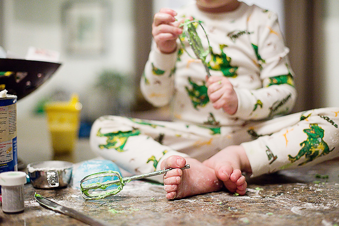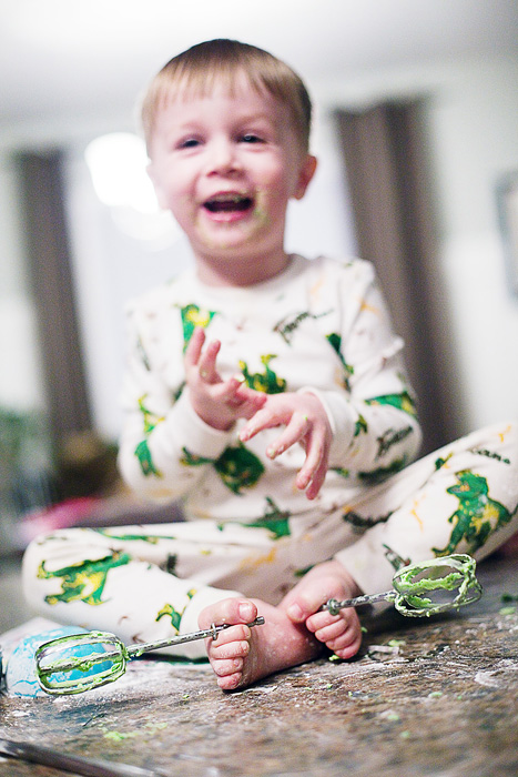 Tonight while I was decorating Porter’s very green birthday cake, I turned around to find this on the island.  Yes, Hudson ditched cleaning the play room after he found the beaters with frosting on them!  There isn’t a doubt in my mind he inherited my sweet tooth.  More than that, notice the use of his toes to hold onto the beater?  He was cracking himself up while Ryan and I just chuckled at him.  This little guy sure makes me happy… and keeps me on my toes!