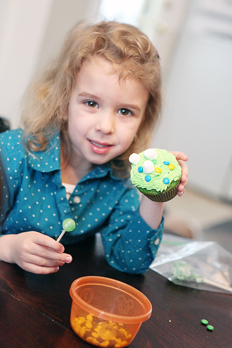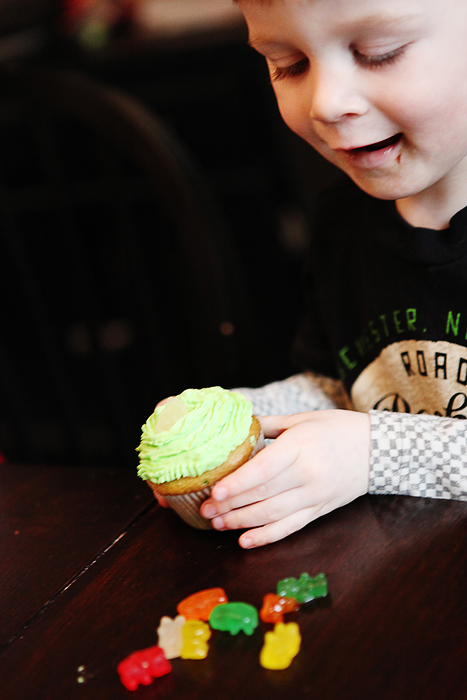Then we decorated cupcakes. It was hilarious because each of the kids had their own little style of decorating. Donnie made a face out of his candy. Porter piled EVERYTHING on. Hudson placed one lone gummy bear in the middle and tried to stock pile the rest of the gummy bears for himself. Nolan put a few gummy bears on, but not too many. Aubri and Lukas meticulously placed each item on top of their cupcakes. It was too cute!!