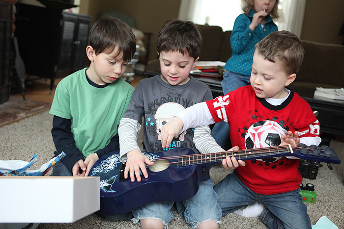 ADROABLE pics! That one of Nolan cracks me up – he is sooo dang cute! And awesome job on the cake! Too bad you guys don't live closer…P & Gav could be in a band…Gav has that same guitar in red.
