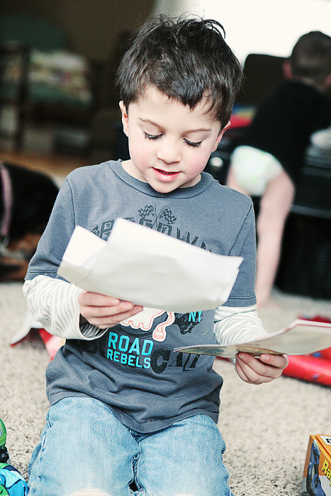 Then we opened presents… Porter got Beyblades from Donnie; Aunt Heather, Aubri and Addi got him a guitar and a Spiderman fishing pole (both at the top of his fav’s!); Oma got him a cool “construction” set and Lukas got him a Target gift card.