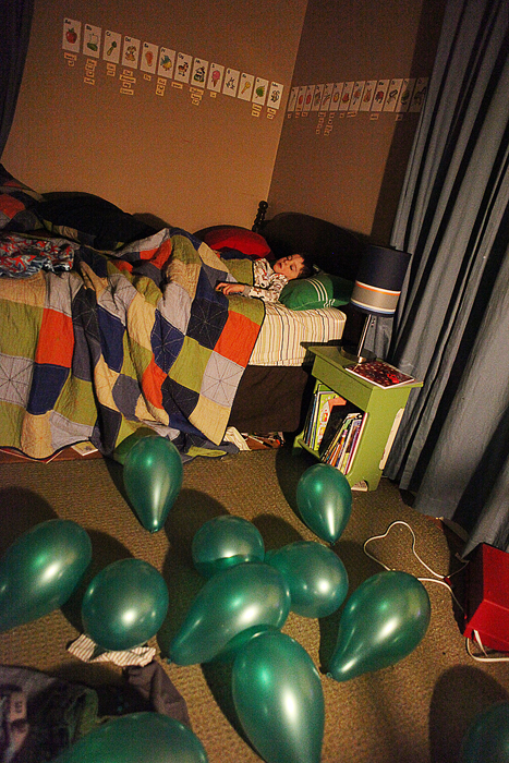 He woke up to Birthday Balloons (all green!) and came and snuggled into bed with me. He must not have remembered last years’ BB’s because he said “Mom, there are balloons all over my floor! Weird!”