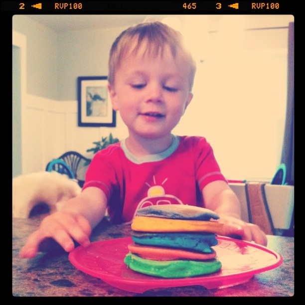 After we played with his balloons for a bit we snuck downstairs quietly so we didn’t wake Porter.  I made him rainbow pancakes.  He was amazed that they were colored and looooved them!  I think these will be a new birthday breakfast tradition!