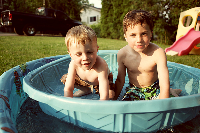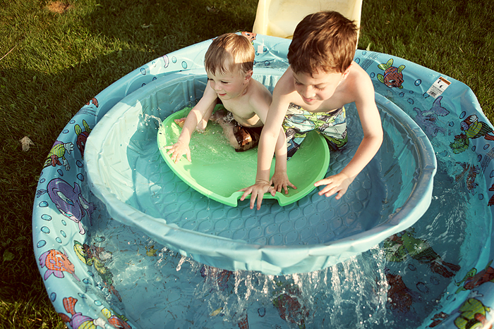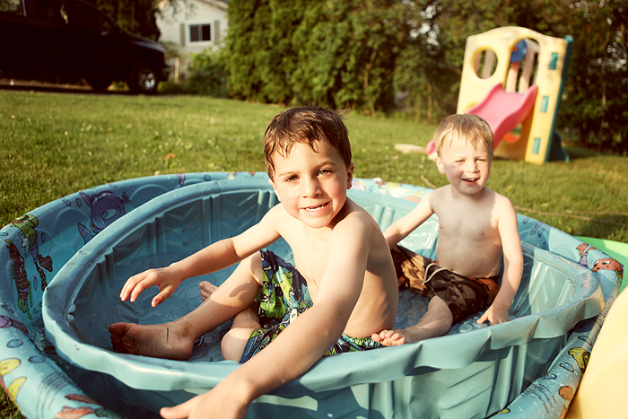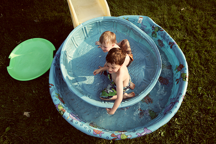 Last week, when we were trying to make it through 95* days, I went and picked up a large pool for the boys to use in addition to their little blue pool. They played outside for quite sometime and I soon found them like this: