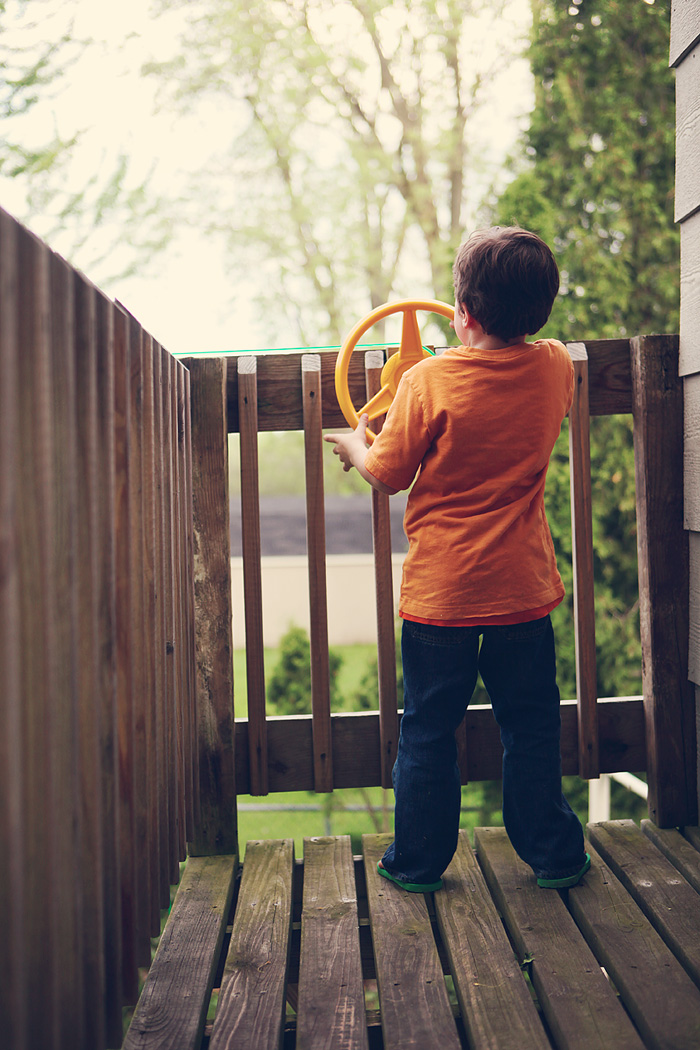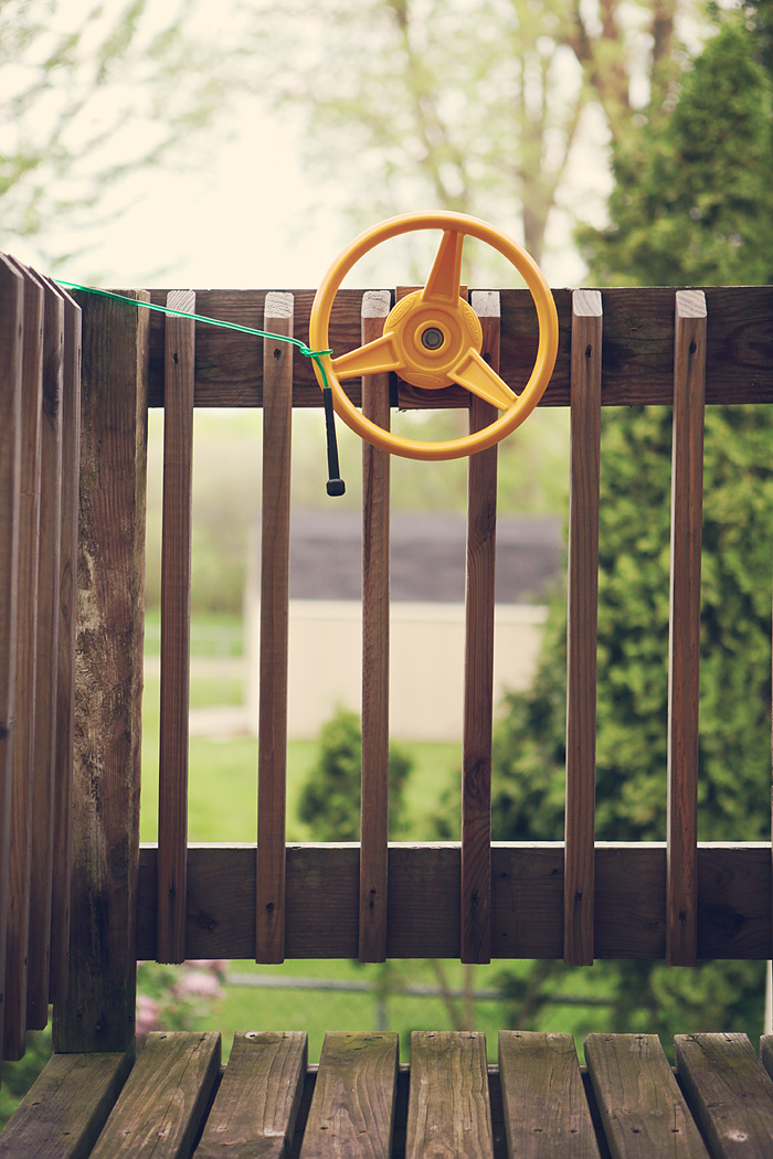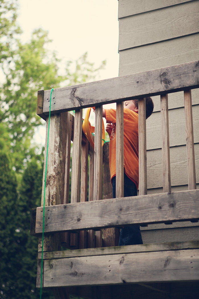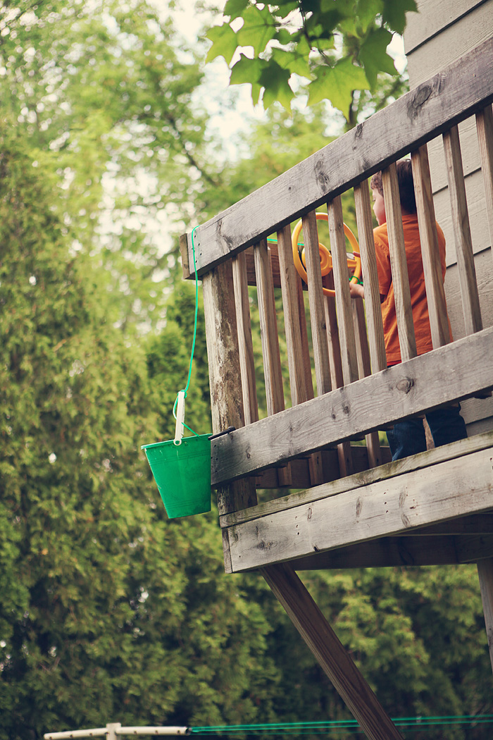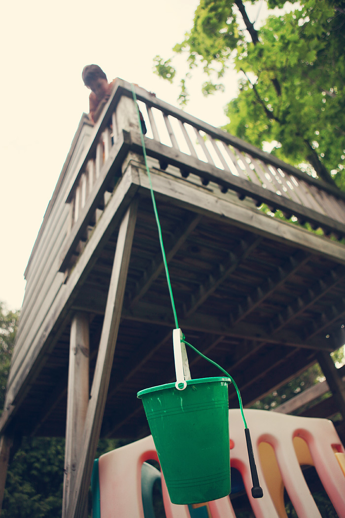 Porter has always been fascinated with how things work. I hope that someday he becomes some kind of engineer or something… he’s curious and very bright and is always trying to recreate things he sees. For the longest time he’s been intrigued by pulleys. He’ll point them out whenever he sees them in use. A few weeks ago he made his own “pulley” (not exactly a pulley but it served the same type of purpose). He had been experimenting with different ways to get his bucket to the top of the treehouse for a few days and finally figured out the best method. Tie the jumprope to the steering wheel and crank it!