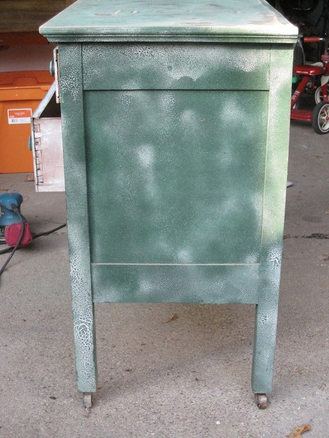 Last fall I was driving down the road, minding my own business when I saw a garage sale. And out of the whole garage sale I saw this piece of furniture. It called to me, yes, it did. I turned around and went to the sale and they had $5 on it. It was MINE! I took it home and quickly realized it was going to be quite a project to get the nasty thick crackle paint off. It sat in the garage over the winter and it was just recently I decided to tackle finishing it.