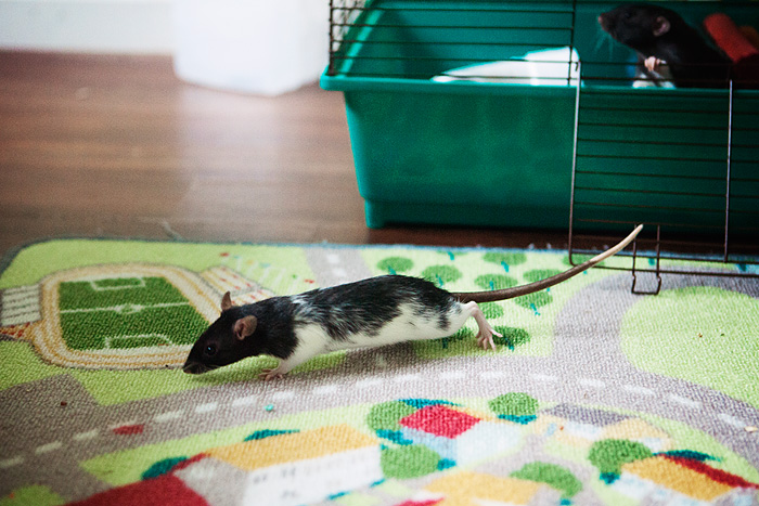 Whenever we go near their cage and they are awake, the rats are scrambling to come near us and climbing all around to get our attention.  We just recently started letting them out of their cage to roam/play.  I’d read online that most rats need some “exploration” time and we decided the playroom was probably our best place to keep them contained.  Originally I thought they’d for sure jet right out of the cage and run from us…. but I’ve found exactly the opposite.  We put their cage on the floor and opened the doors.  They were all extremely curious to get to the door and climbed outside onto the top of their cage but they were very very cautious about exploring the ground and surrounding room.  They would scamper over to us and climb into our laps and then go back to their cage.  They seem to view their cage and us as their “safe places”.  Today Atticus was getting a little more adventurous.  He roamed around more and explored near the bookshelf but for the most part he stayed near me, Porter or his cage. Polly has surprised us with a bit of a personality shift.  Originally she was the shy one and Cricket was the bouncy, active, curious one.  Cricket still is a little more active than tiny Polly but Polly has become a little braver than Cricket as far as exploring outside the cage.