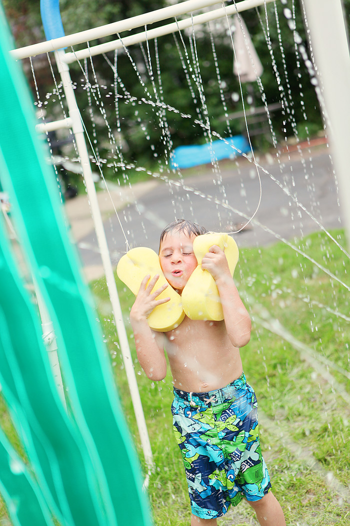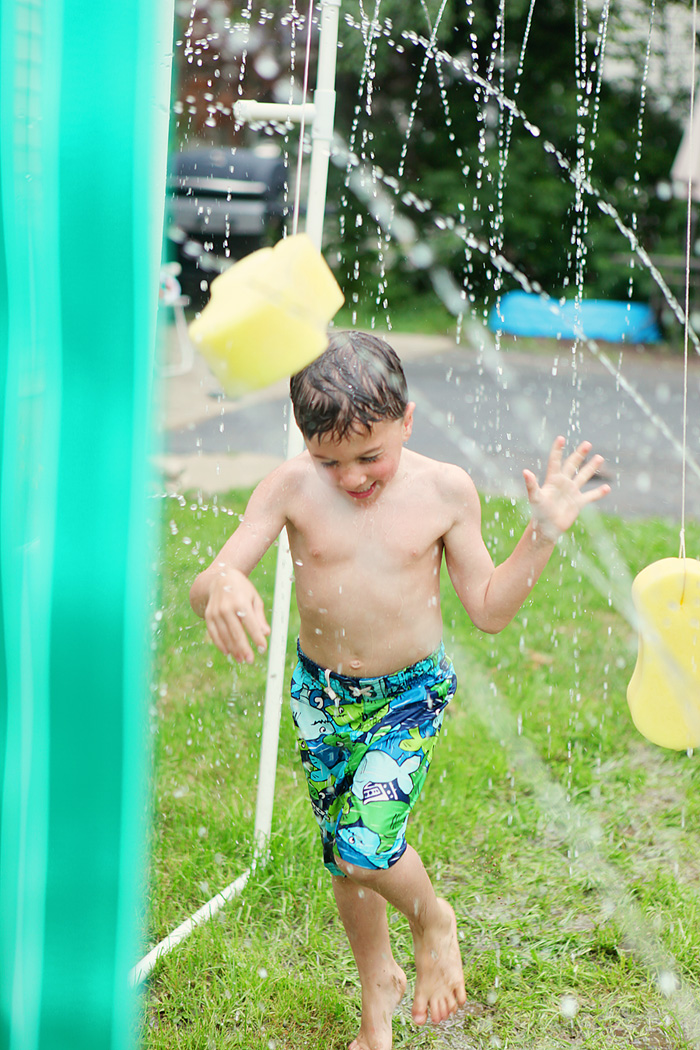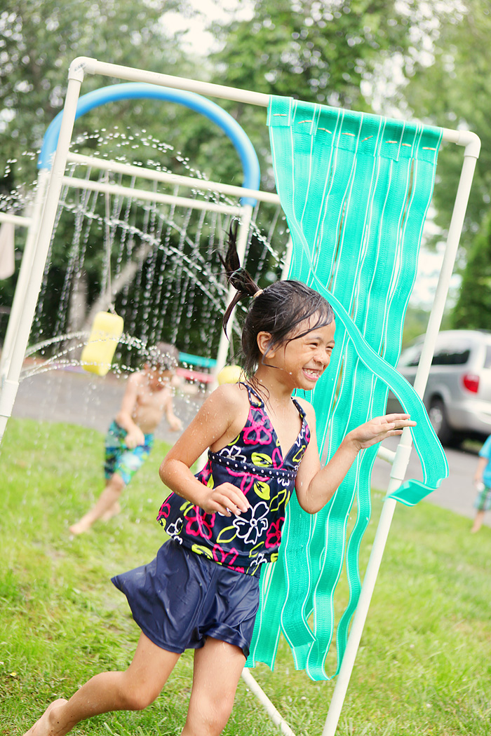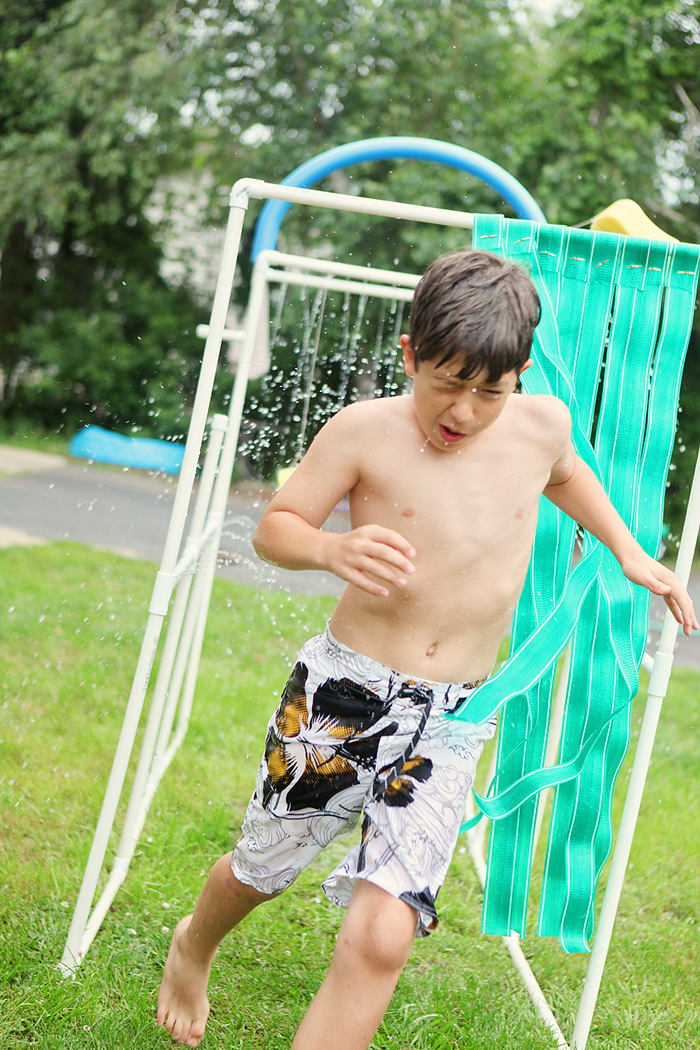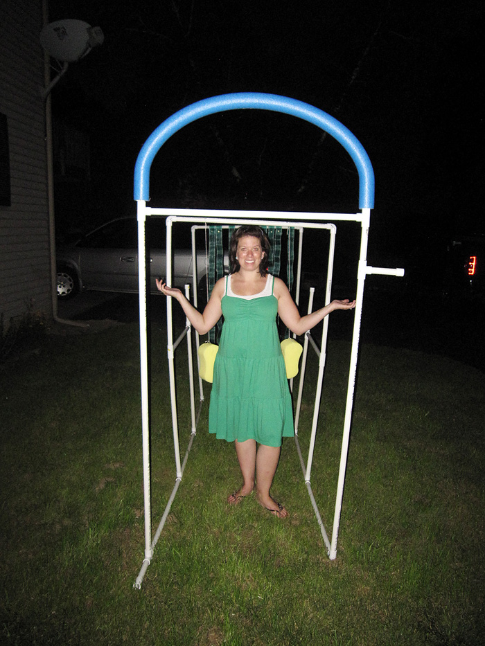 The other night I went to Menards and picked up the PVC pieces to build this awesome Kid Wash. I got home at 9pm and was too excited to wait until morning to make it. I got right to work, dress and all. It took me about an hour to make all the cuts (probably would have been less time if I knew how to measure. Measure twice, cut once… right?). I had it assembled by 10pm and made Ryan take a picture.