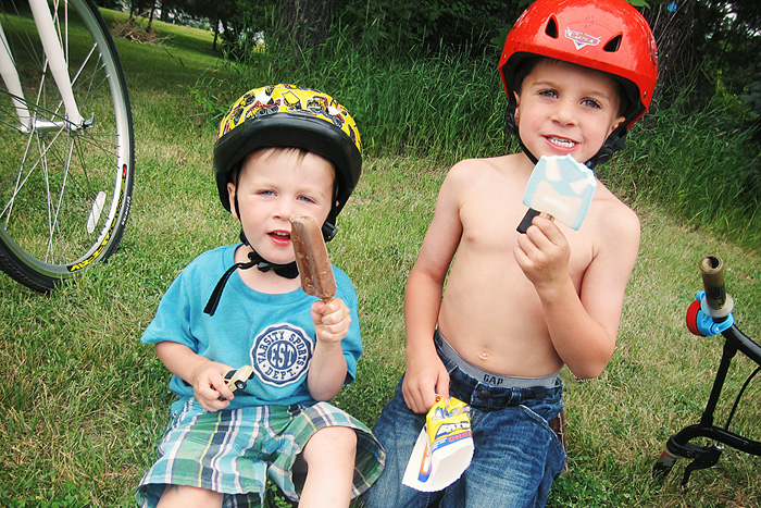 The boys are loving our bikes. Well, my bike. We have gone on quite a few bike rides- a 3 mile one the other morning and then again that evening to chase down the ice cream truck. I swear he teases us as we hear the music almost daily but they don’t come down our street. The boys and I were bored (I think Ryan was at class?) and so we hopped back on our bikes to take another ride. We caught up with the ice cream truck on Flansburg Rd and sat down along the side of the road and ate our ice cream. Yeah, we’re cool like that.