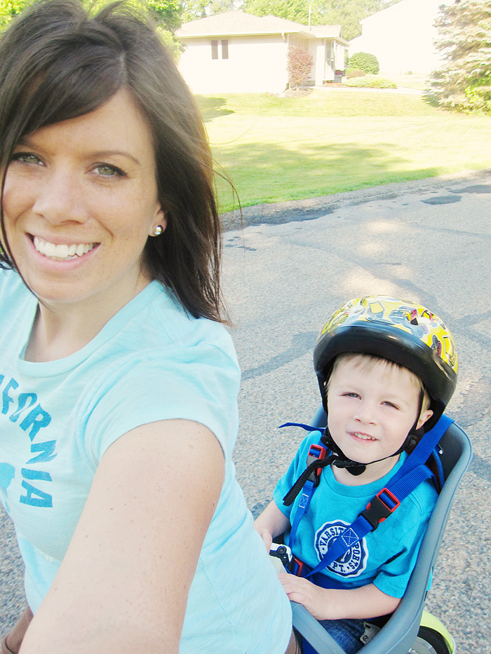 Friday we rode close to 3 miles again- we went up to Porter’s school (in the fall) and the boys played on the playground. Porter has been doing extremely well riding on roads with me (we don’t have many sidewalks nearby), and Hudson LOVES riding now. He cracks me up because Porter and I will say “Whew that was a big hill!” and Hudson is like “Yeah, that was a big hill!” I’ll ask P how he’s doing and Hudson responds with “I’m doin’ good”. As if he’s doing any of the work! He gets ticked when we head home and starts to throw a tantrum. I am pretty sure he’d bike all day long if someone would ride him that long! I’m really glad I took the plunge and got a bike. I wish I’d done it last year! Oh well, better late than never. I’m hoping tomorrow and next week aren’t too hot/humid and we can get out on our bikes some more. We’ve been going on early bike rides… around 8/9am so it is perfect weather then usually.