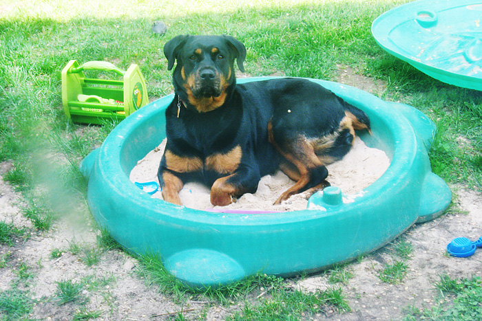 Ramsey was our Francis Street drug-money rescue puppy.  When we had purchased our first home, I had found an ad at the grocery store for Rottweiler puppies…. $125.  Bargain!  (if I’d only realized).  I called and the guy (obviously “inner-city” type) told me “Yeeeahhhh, dis guy owned me sum muney so he gave me some ‘rockweiller’ puppies.  I gots me 6 kids so I aint’ got no time to take care of a puppy.”    YEIKS.  So, we went to see her, the last puppy left.  She was scrawny at 14 weeks old, and we fell in love instantly.  We took her home.  We joked that she must have been drug money trade… I’m sure there was more truth to it than we liked to think.