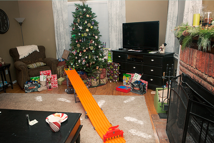 That night I slept like doo doo… waking up at 3am and sleeping restlessly until we were woken up at 6am by a flashlight shining in our eyes, and Porter yelling “Everybody! Everybody WAKE UP! Santa Came! Get Up Get Up Get UP!!!! You won’t believe it! He left FOOTPRINTS all over our LIVING ROOM!!!” His excitement was classic and I hope I never forget his amazement that morning. He raced downstairs after waking Hudson up and we all attempted to follow suit quickly. He made sure to show us every piece of evidence that Santa had been here…. “Look at these footprints!” “Look! He left this huge race track!!” “WHO ate this apple and left the core!” “Look at our stockings and the presents!!!” Hudson was kind of in a daze at this point and just like last year missed his own stocking and pile of presents and headed towards Porters 🙂 Once he was guided in the right direction, they began opening their loot. They both were so excited over every little thing and it was so fun to watch.
