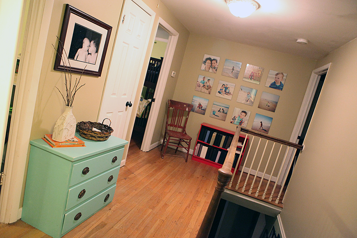 And our upstairs hallway.  Remember it used to look like this?  Well… last fall-ish I updated the wall collage with all beach pictures.  I love the colors!  I pulled some of the red and orange and teal fromt he pictures and used the colors for furniture/accents.  I plan to repaint that chair the aqua color and distress it so some red comes through.  And I’d like to get some teal/orange do-dads to put on the book shelf.