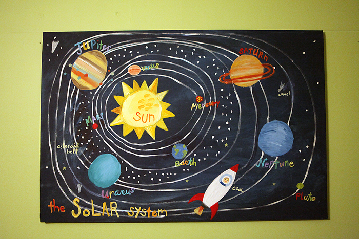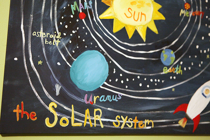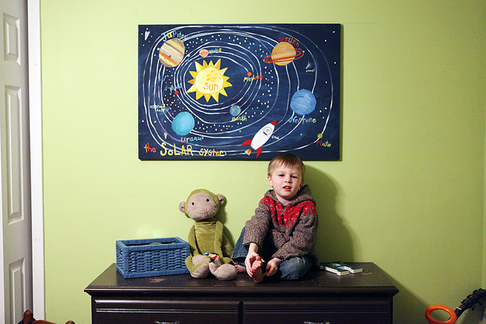 And onto Hudson’s room… the poor kid hasn’t had any artwork in his room since his nursery pictures.  I started painting this Solar System (knock off from Land of Nod) back in… 2010… 2 years ago really… when I began sewing his quilts for his “big boy bedroom”.  I never finished the painting and it has been in the basement ever since.  I finally started to feel bad that Porter’s room is all decorated and I’ve been so obsessed with decorating baby sis’ room, but Hudson’s was pretty bare and simple. (not to mention his wall is still under construction from 3.5 years ago when we moved in!!)  So… I finished his painting today.  And he’s so proud of it.