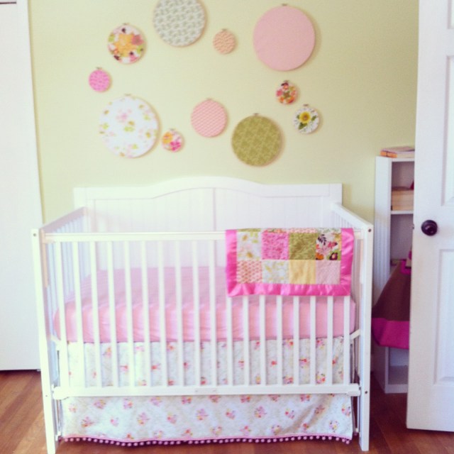 I’m still debating on location of these wall decor items.  Originally I had planned to put her name (if we ever decide on one) above her crib in the space between the circles.  But I almost would like to put the circles above the dresser and her Sunshine plaque above the crib.  But I’m kind of nervous to put a 2’x2′ piece of plywood above the crib.   I would really like to do a wall collage with a mix of vintage prints and photographs… but not sure what wall to do those on.