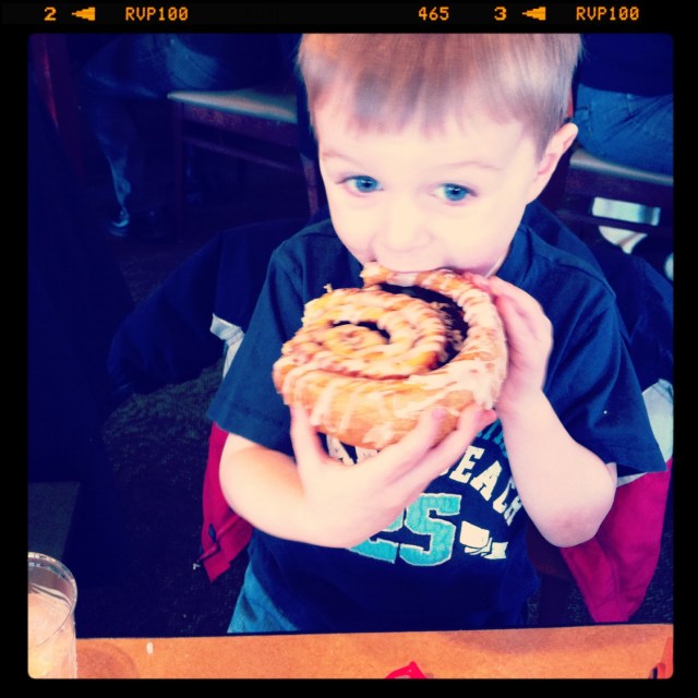 We spent the day in Ann Arbor… dropped Porter off at school, had my doctor’s appointment (ughhh) and then went to brunch at Panera. Hudson chowed this ginormous cinnamon roll! Then we went to Children’s Orchard (scored an Automoblox for $7.99!) and then to Once Upon a Child where I found two pair of maternity pants. Then… we headed home.