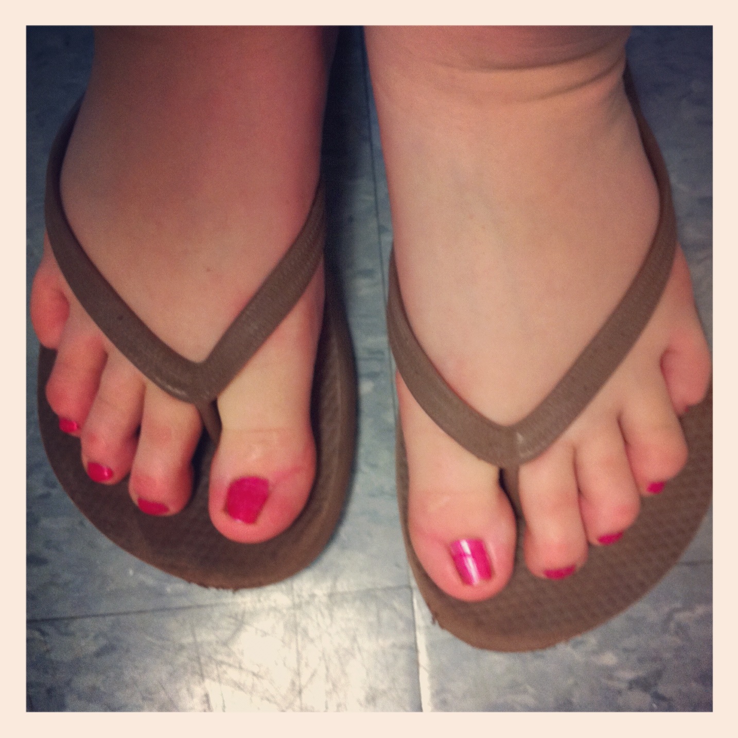 • And speaking of feet… I painted my toes the other day for the first time since last summer.  Hudson was intrigued and wanted his toes painted too.  He wanted red, but I didn’t have any red.  So he wanted pink.  Ryan was not too happy, but Hudson LOVES his pink toenails.  Its hilarious.   And of course when we went to my doctor’s appointment he wanted to wear flip flops.  HAHA!