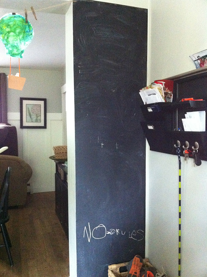 I went downstairs, where teh boys were watching a movie and asked Porter what happened to the chalkboard. In his 6-year old baby-talk voice he smirks and says “No rules!” I asked… “What was that?” He says it again, still smirking. “No rules! There are no more rules!”