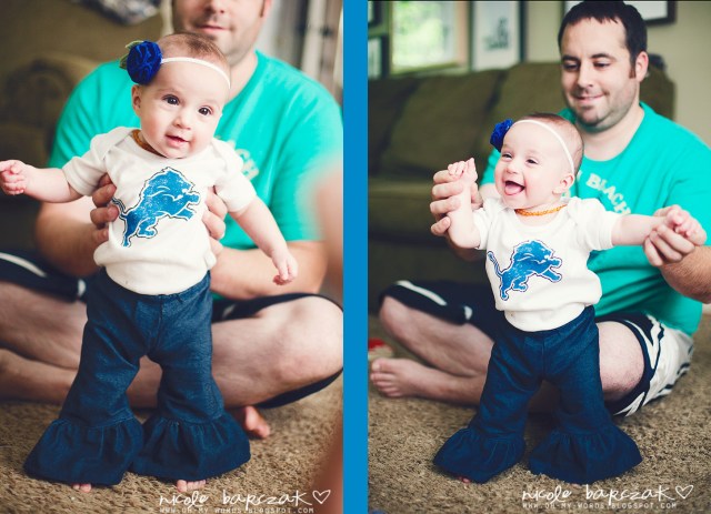 When I was pregnant with Amelia, one of the few purchase he requested for her was Lions and Tigers gear. He found this onesie at Old Navy while we were shopping one day and here she is… time to wear it! I thought it’d be perfect for the Lions’ first game. I made some ruffle jeans for her and of course a headband! She looks pretty darn cute, if you ask me!
