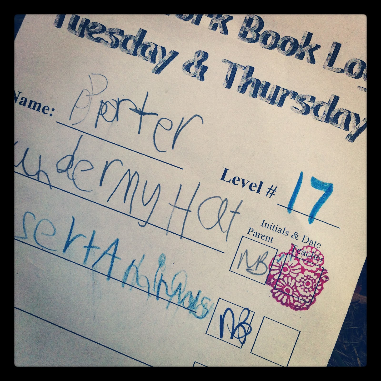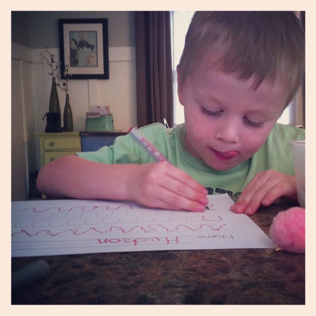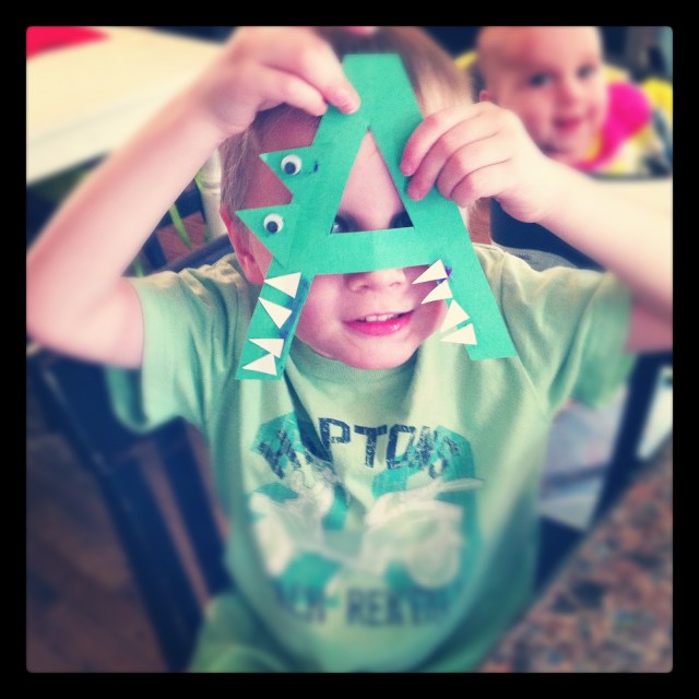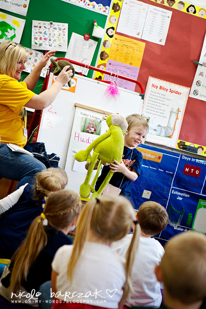 Both boys are doing their “All About Me” stuff this week and next. On Wednesday, Hudson got to bring home the “Knee Bag” (errr.. “Me Bag” though he calls it the Knee Bag!). He had to pick out something special to put in the bag and write 3 clues about it in the notebook. He chose his green monkey. He was so so so excited to be Helper that day and to pull his monkey out of the bag to show everyone.