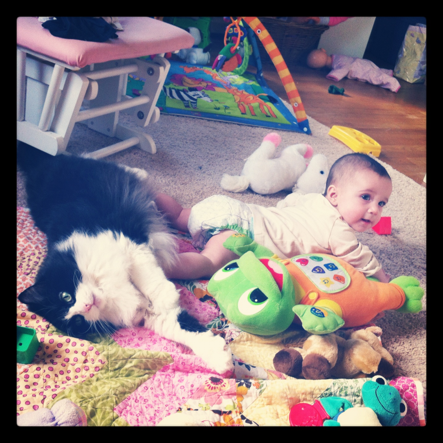 Ella loves her too. Yes, we have a cat! Can you believe it? We finally are attempting to let Ella back upstairs (her home has been the laundry room for the past… uh… year?? ever since she peed on the guest bed in teh basement). She loves Amelia. Amelia loooves to grab her. (I imagine her saying in her head “SHE’S SO FLUFFY I COULD DIE!” cue Despicable Me)