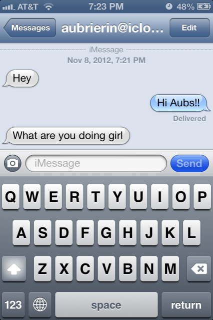 I got a text from Aubri last week…. cracked me up… “What are you doing girl” HAHA! SHe and I have been texting back and forth…. I send her pictures of Amelia and the boys, and we tell each other good morning and good night. SO sweet. LOVE IT.