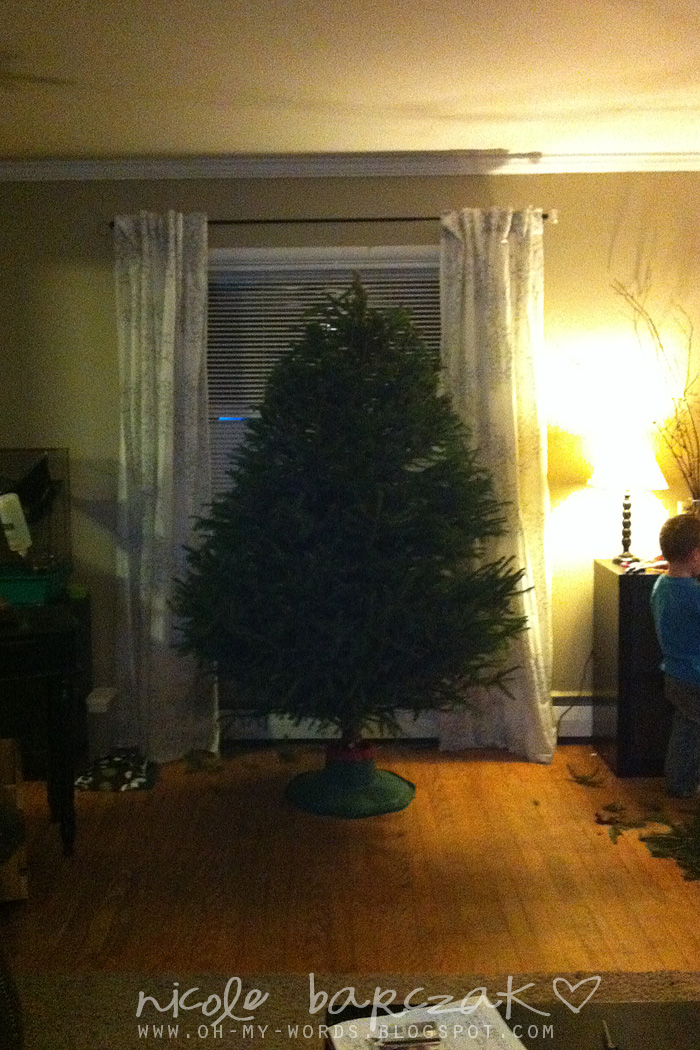 Here’s where the fun begins… are you ready for some laughs?? When we finally got around to bringing the tree in it was dark. Ryan went outside and when he brought the tree in the first thing I thought was “WOAH… way too big.” We obviously either overestimated the size of our house or underestimated the size of that tree. The second thought? “What the hell happened to the top of the tree and why is there so much trunk showing?!” (Ryan says “I only trimmed a little off the top!) I am pretty sure this is why he said to me “I”m going to run up to Menards for garbage bags… and look at their trees.” I shot the idea down. NO! We went and picked out our tree and we’re going to make it work! Little did I know he’d hacked a hunk of the top off of it! HAAH!