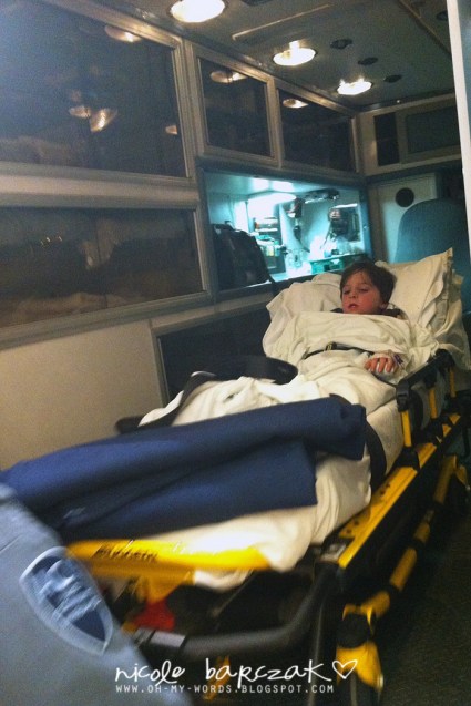 8:30pm: Porter was somewhat awake for his first (and pray to God only) ambulance ride. He was funny coming off the sedation- he said I had 4 eyes and every time we passed a semi he’d say “what the heck was that?!”