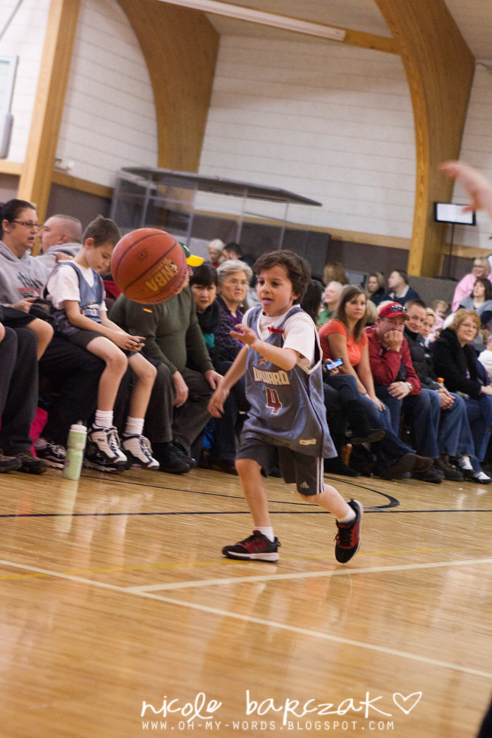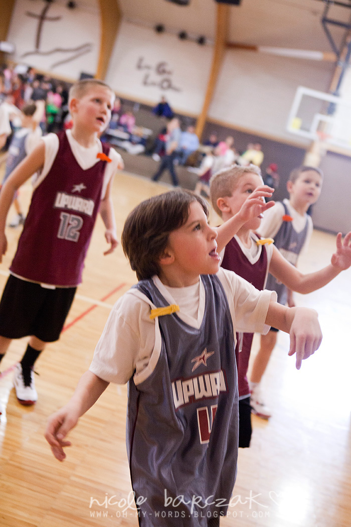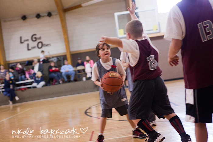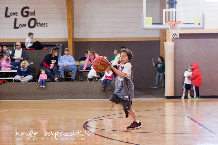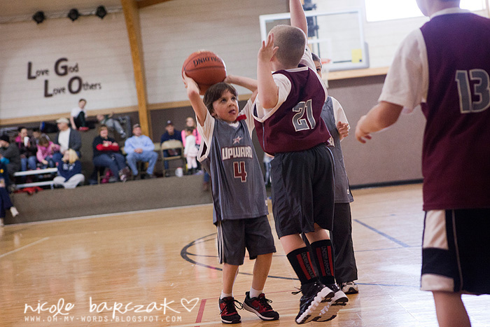 Porter has only had…hmmm 3 games so far? I’m already noticing a lot of improvement. The first game cracked me up. He got out there and looked like he was raring to go. Clapped his hands together. Kind of jogged back and forth on his feet. Feet apart. Knees bent. Arms braced to go. And the game started and I was cracking up. He pretty much played a glorified game of keep away. Loved it. SOOO funny. He had the whole “where’s your guy” down… he was NOT about to let “his guy” guard him. He spent his time on the court running FROM the guy who was guarding him. This got him a basketball to the face because he was so focused on not letting the guy near him he wasn’t paying attention whatsoever to the basketball.