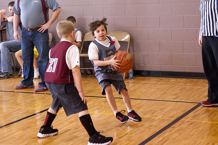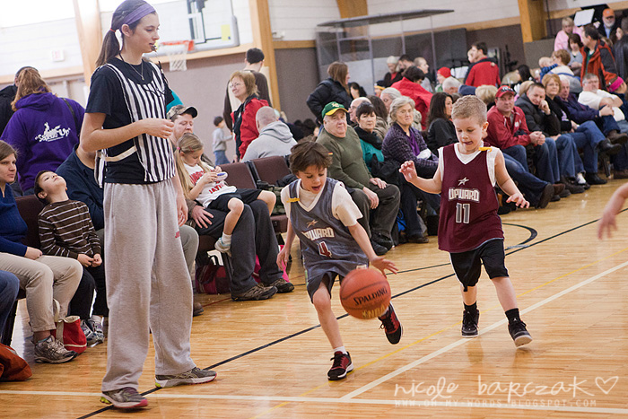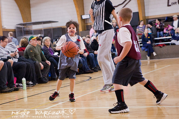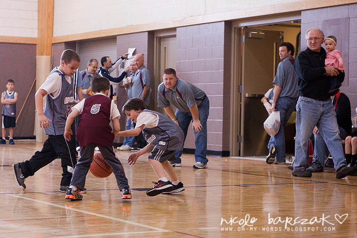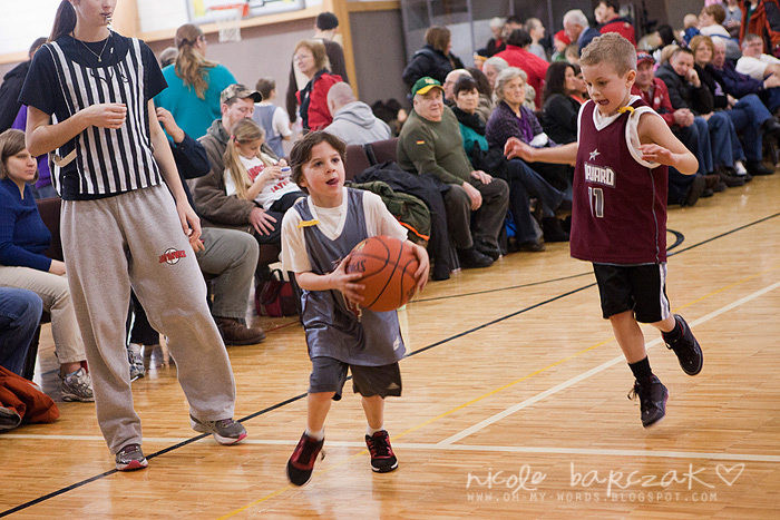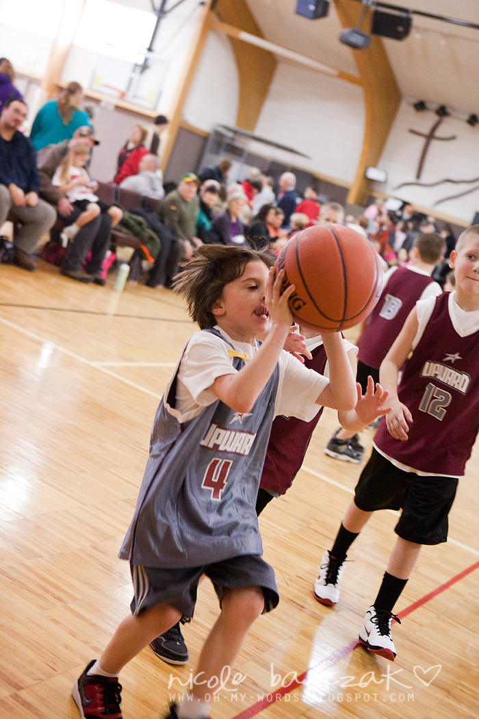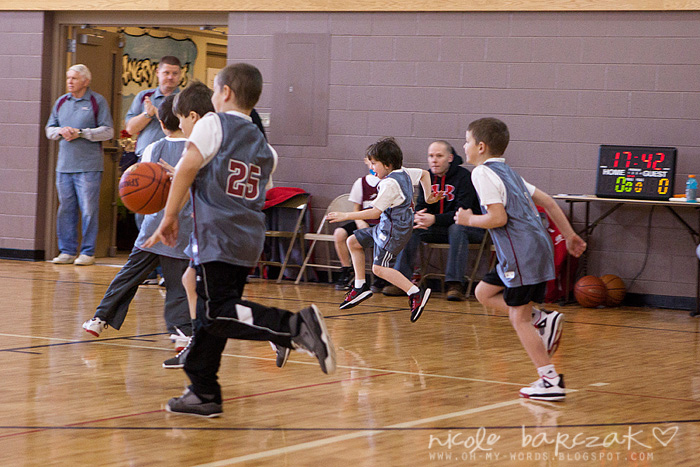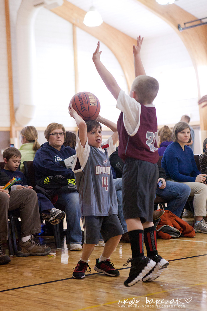 Porter has only had…hmmm 3 games so far? I’m already noticing a lot of improvement. The first game cracked me up. He got out there and looked like he was raring to go. Clapped his hands together. Kind of jogged back and forth on his feet. Feet apart. Knees bent. Arms braced to go. And the game started and I was cracking up. He pretty much played a glorified game of keep away. Loved it. SOOO funny. He had the whole “where’s your guy” down… he was NOT about to let “his guy” guard him. He spent his time on the court running FROM the guy who was guarding him. This got him a basketball to the face because he was so focused on not letting the guy near him he wasn’t paying attention whatsoever to the basketball.
