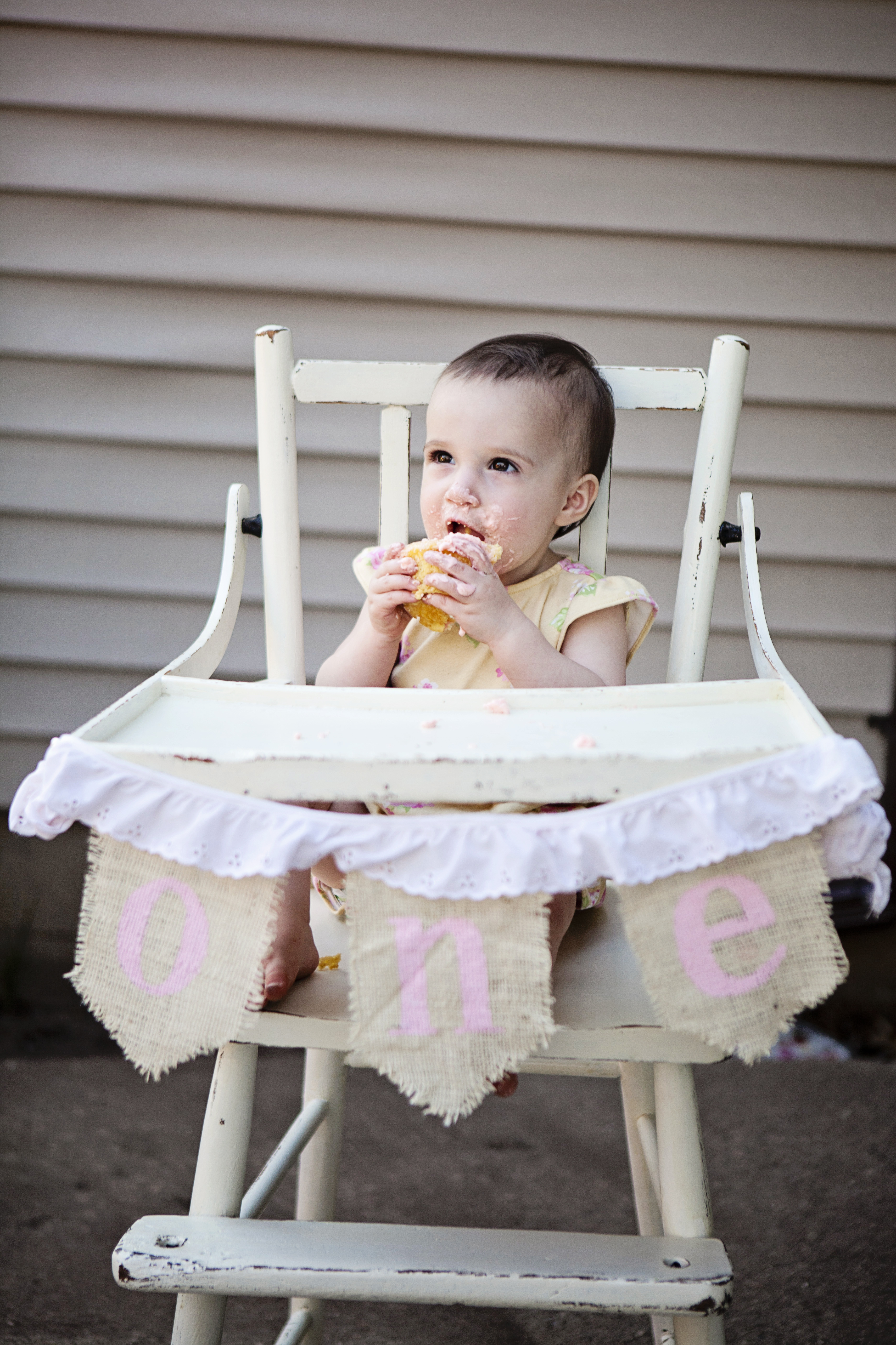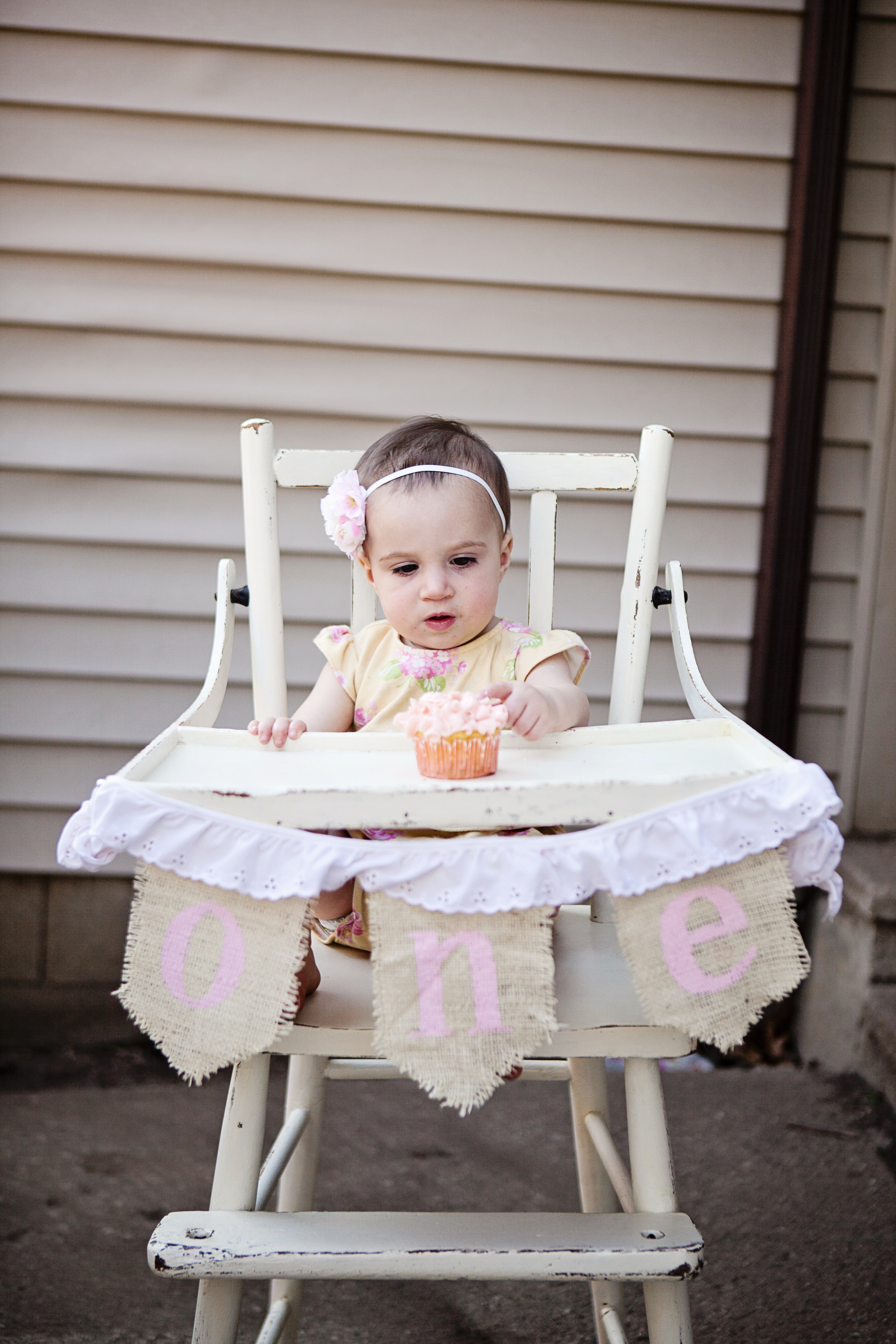 I made the tissue paper pom poms for the ceiling, threw a shutter on the table with milk glass vases and fake flowers in them. The cupcakes and cake I made. The crown on her cake is a piece of lace, which I soaked in fabric stiffener, shaped into a crown and let it dry and then painted it gold. Everything from this party was DIY, secondhand or stuff I had around the house! Well, except her high chair. I hunted that baby down and repurposed it. I had a vision for it 🙂
