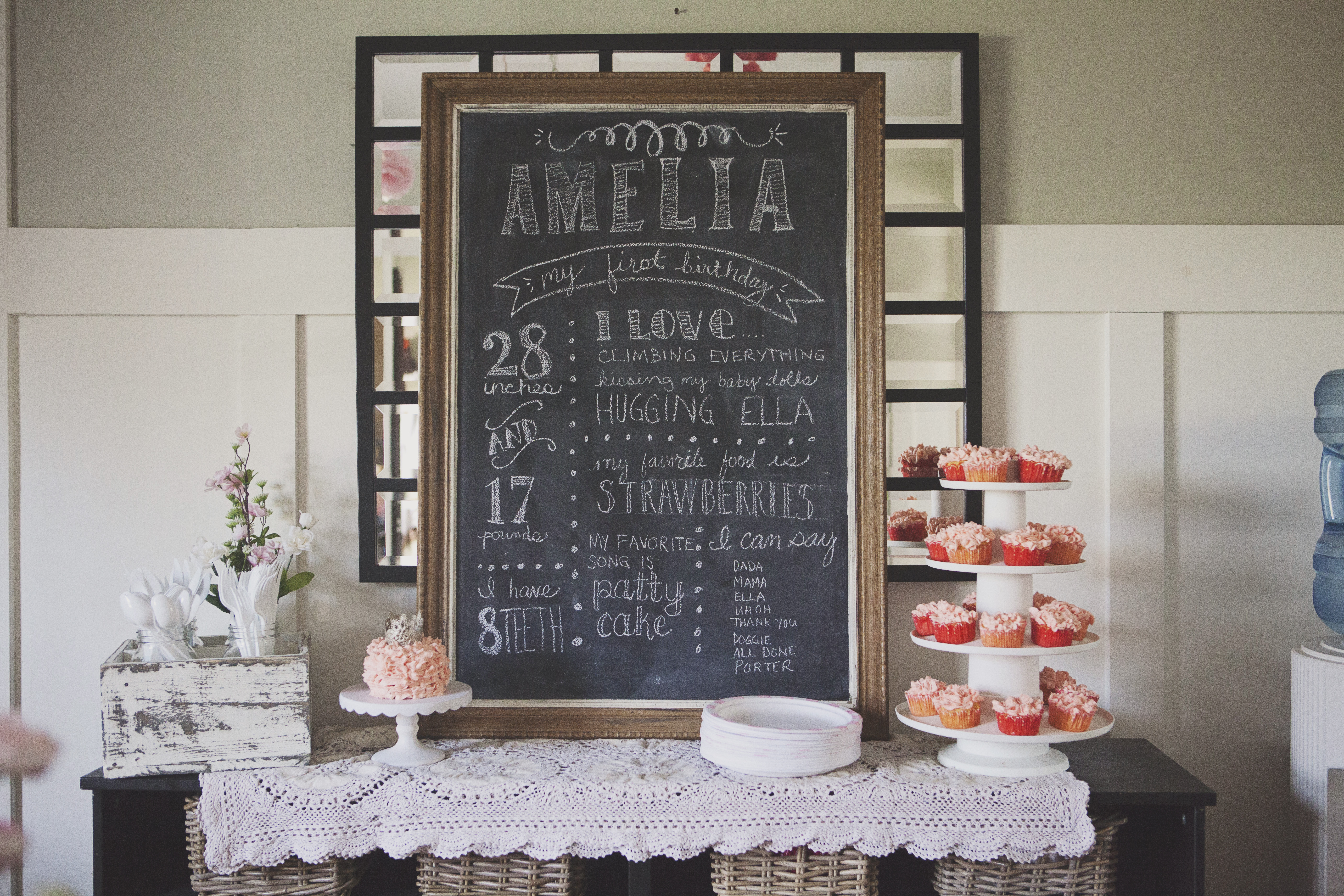 The chalk board was an old painting I bought at a second had shop. I pained over the picture with chalkboard paint. I hand drew the letterboard graphic to highlight all the things about Amelia at 1 year old.