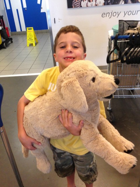 Lately he’s been really into stuffed animals. The last month of school or so he took one of his stuffed dogs to school with him in his backpack. He would tuck him in so his head was sticking out. Then, a few weeks ago our neighbors had a garage sale and he brought home a little Dalmatian stuffed dog. He named him Spot and has been toting him along everywhere. Last week he and Hudson turned two large (LARGE) boxes into dog houses and he tucks his dogs in to sleep every night. The other day we went to Ikea with my mom. He fell in love with this huge stuffed dog and suckered my mom into buying him for him. He’s been playing with that nonstop since he brought him home. He takes “Samson” outside with him, on the trampoline, in the treehouse, etc. At night he makes him a bed next to him with a pillow and blanket. Love it love it love it.