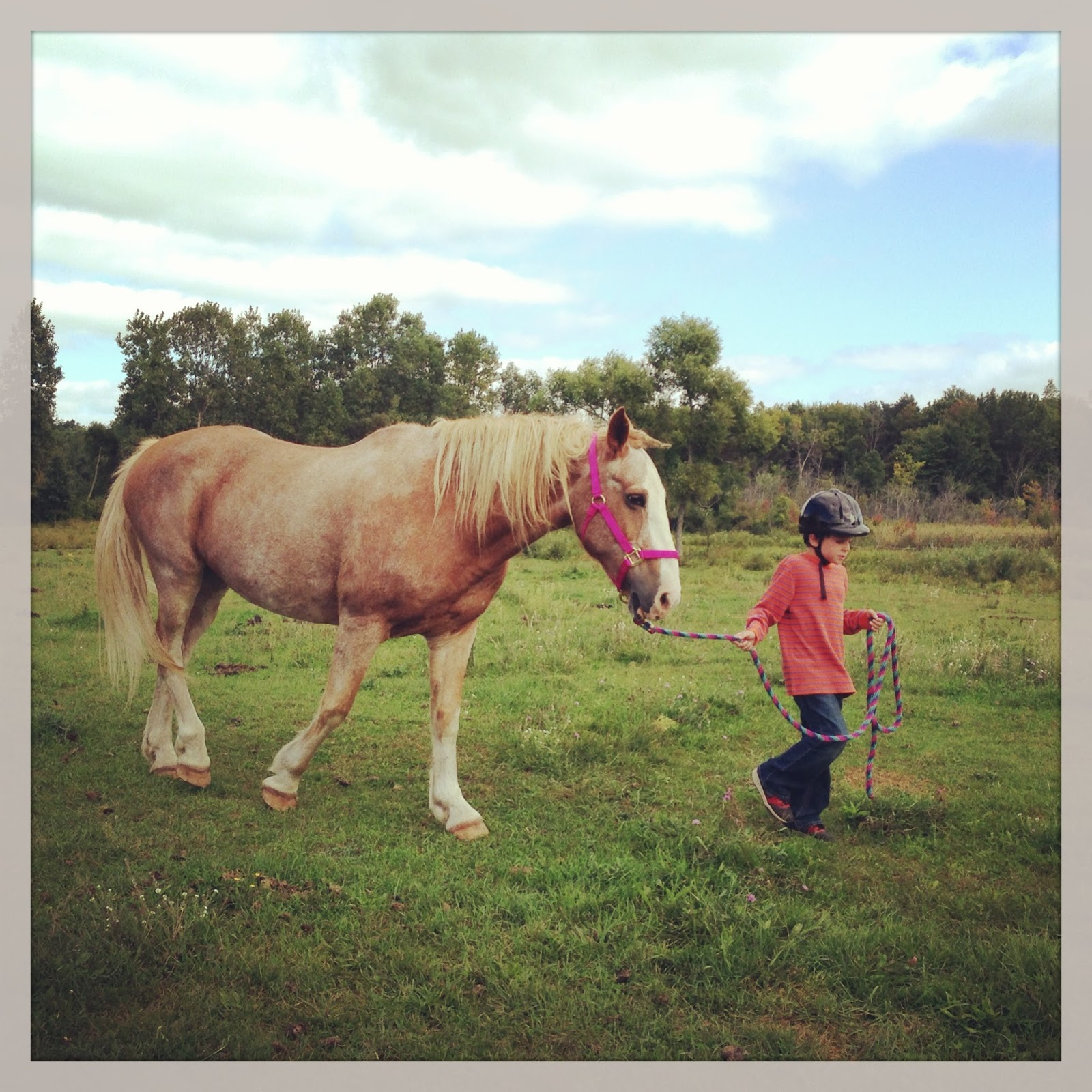This afternoon while Ry took Hudson to soccer practice, Porter and I went to the barn for his first “official” riding lesson. (I’m telling you, though, I am in desperate need of lessons again myself! You forget a LOT after 10 years away from daily riding!) He was really excited to get Lacey out of the pasture and wanted to learn all about the other horses (which I know nothing about, except for Silver- who Lacey has become very fond of!). Once I haltered Lace, I let him lead her up to the barn. He is so confident with her, and she is such a good girl with him. It melted my heart to see MY child leading MY childhood horse. I never imagined this would come so full circle… that my kids would enjoy this sweet mare that I grew up with.