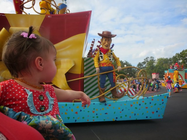 We watched the parade- awesome. Kids loved it. Then we went to head back to the castle and the streets were packed. See… the parade ended in Frontierland which meant by the time it ended for us it had been over for awhile back on Main STreet… thus the crowds had filed in and packed the streets before we even finished watching the parade. We had barely got in sight of the castle and the castle projection show started. And at this point Porter had to take a dump BAD…. he has his father’s stomach and he had to get to a bathroom ASAP. Well, Ry took him so my mom, the kids and I tried to get in view of the projection show- one of THE main things I soooo wanted to watch. The crowds were awful, it was hot, sticky and claustrophobic. UGH. We barely got to see the show and then we met up with Ryan and by then the fireworks started and we were behind a tree with terrible view of the fireworks. I was bummed. Porter was whiny and wanted to go back home. We made him stick it out for a little bit while we took Hudson on Thunder Mountain Railroad one last time and then we headed home. I was disappointed that our evening was cut short. I figured Fantasyland would have low crowds since a lot of little kids head home to sleep and we’d be able to get on some of the rides quickly but Porter wanted nothing to do with it.