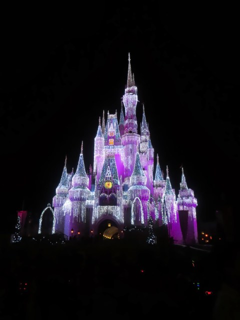 We came back for the night festivities. This was the last night we were able to see the parade/fireworks as the following evening was the Mickey’s Christmas Party (which would have cost us $300 to attend). I’d read that for the Electric Parade we could find seats around half an hour early but…. we got there at 5:15 (the parade started at 6) and the streets were PACKED. One of the cast members told us to head to Frontierland as the crowds would be thinner and we’d find a seat, then we could move back in toward the castle for the fireworks as they fill the streets in. Seemed like a good plan at the time.