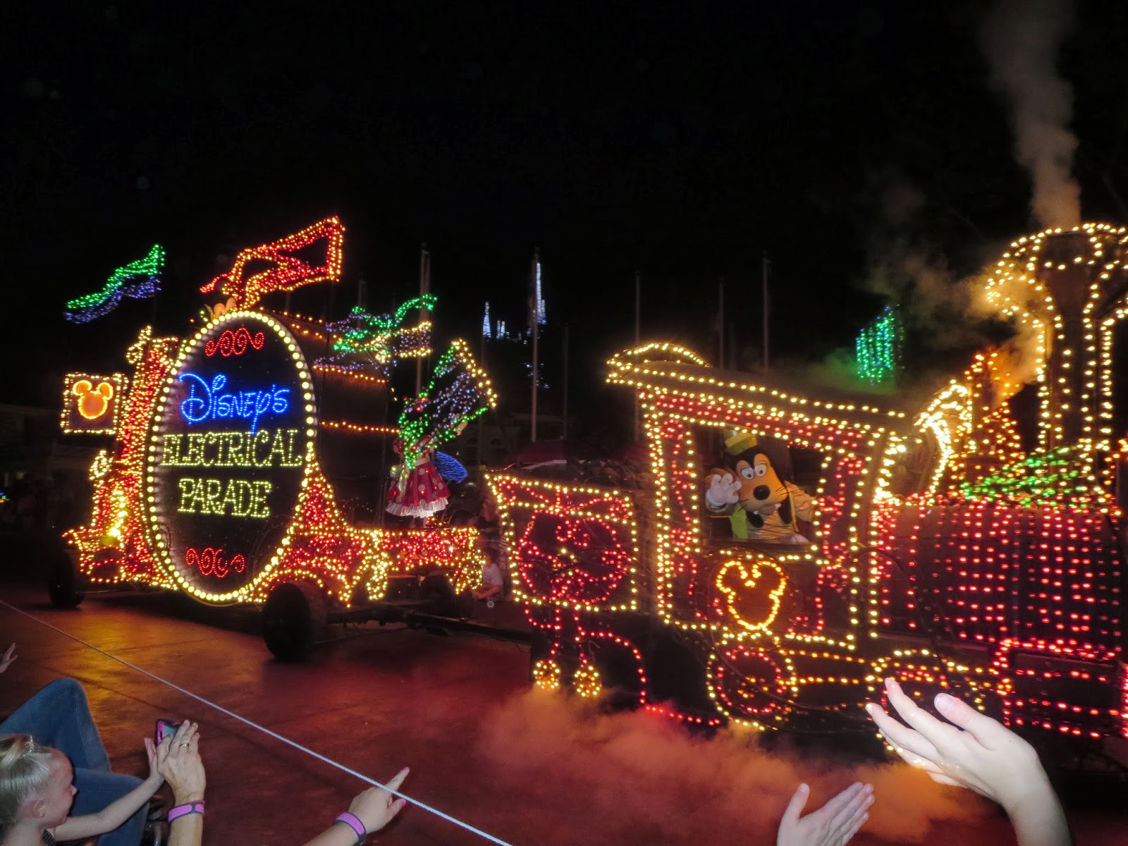 We came back for the night festivities. This was the last night we were able to see the parade/fireworks as the following evening was the Mickey’s Christmas Party (which would have cost us $300 to attend). I’d read that for the Electric Parade we could find seats around half an hour early but…. we got there at 5:15 (the parade started at 6) and the streets were PACKED. One of the cast members told us to head to Frontierland as the crowds would be thinner and we’d find a seat, then we could move back in toward the castle for the fireworks as they fill the streets in. Seemed like a good plan at the time.