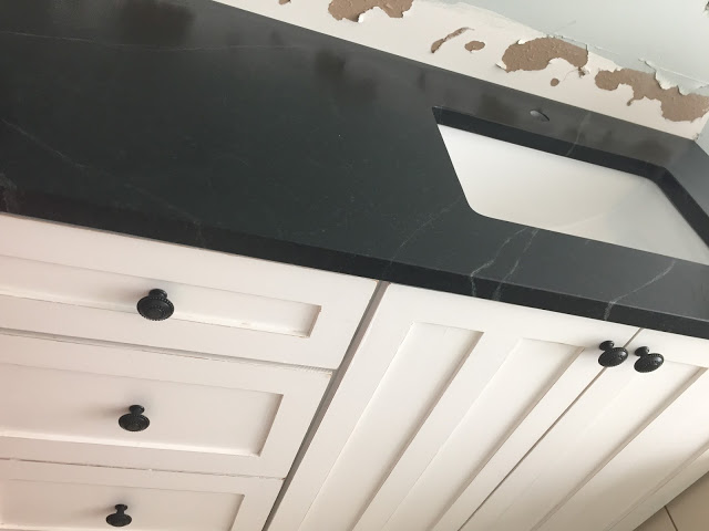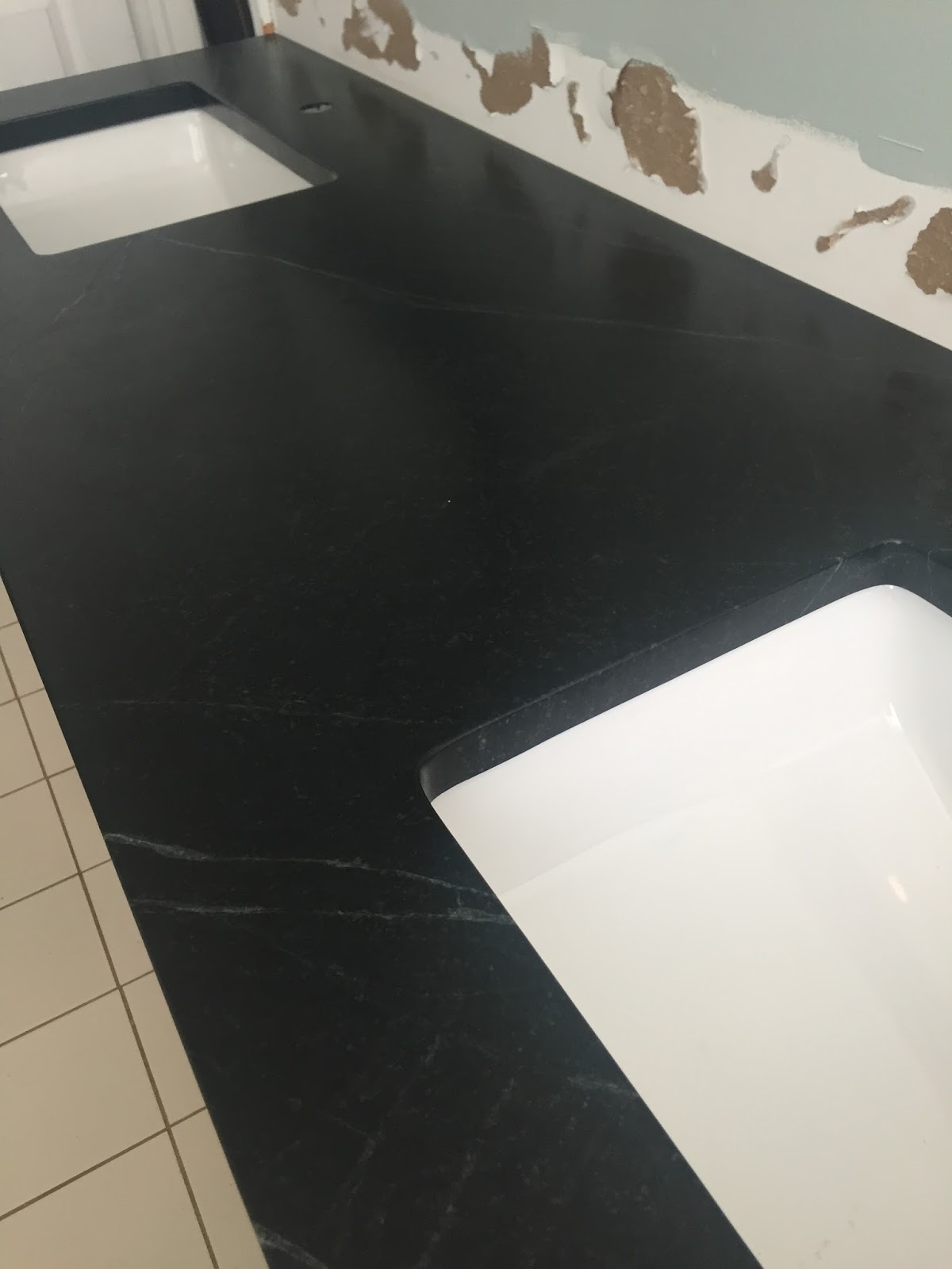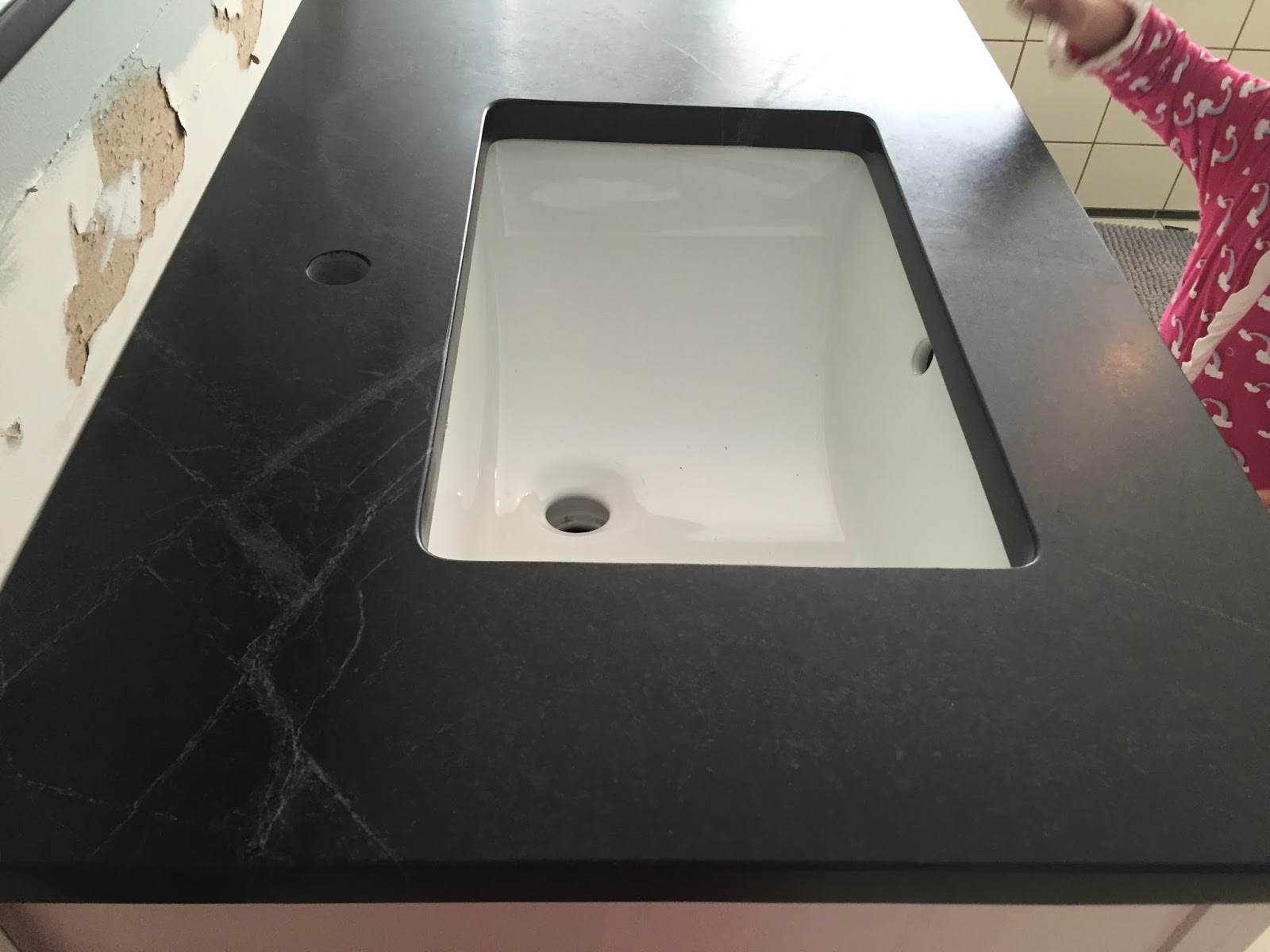 Now its time for countertops. Again, the master bath gets to be my guinea pig for the kitchen. I really really really wanted soapstone in the kitchen but had heard it was super soft and not super durable. But I loooove the worn look it has. So, the master bath gets soapstone. I freaking love it. In my mind, its like granite and marble got together on a one night stand and had soapstone. It has the veins of marble, the granite specks and unevenness, and throw in a bit of matte finish… AHHH! In these pictures I have it oiled (mineral oil) but I rarely oil it because I like the dry, matte finish. We’ve had it for almost a year and would I do it again? In a heartbeat. I LOVE IT. I’m actually considering it for the kitchen. Hmm.