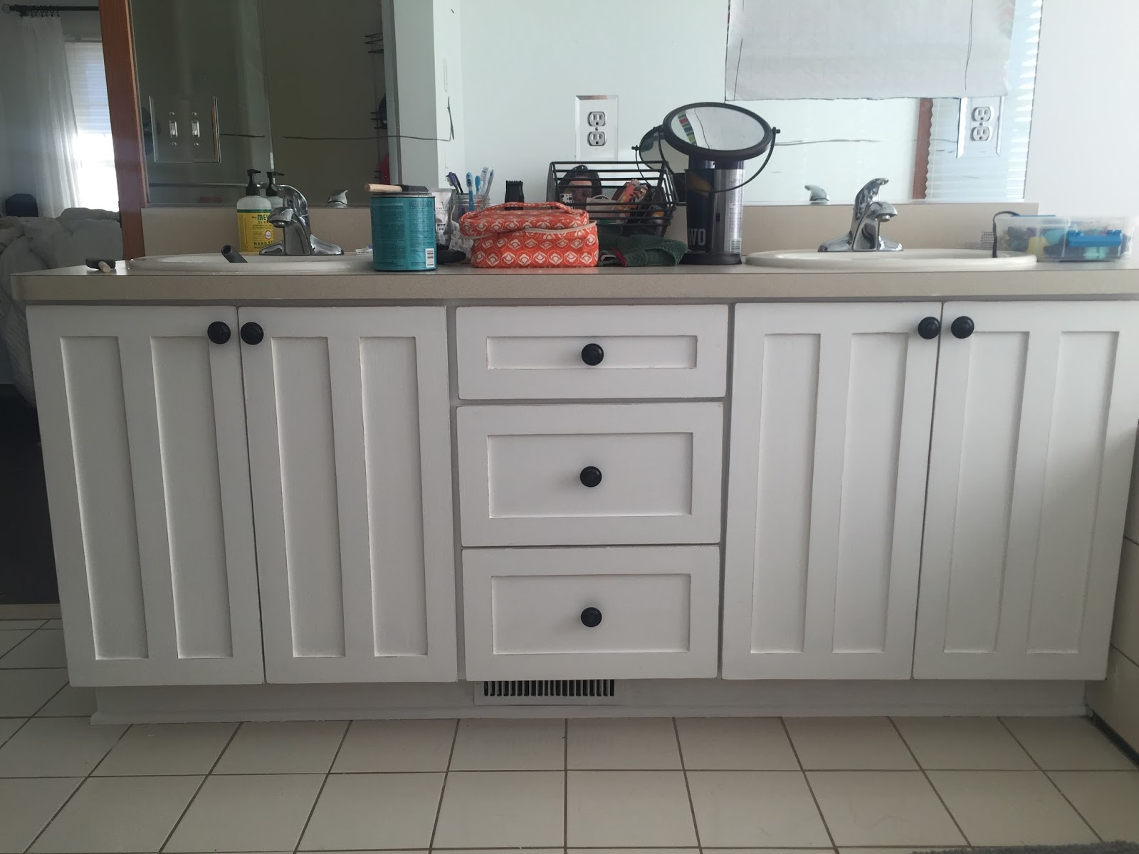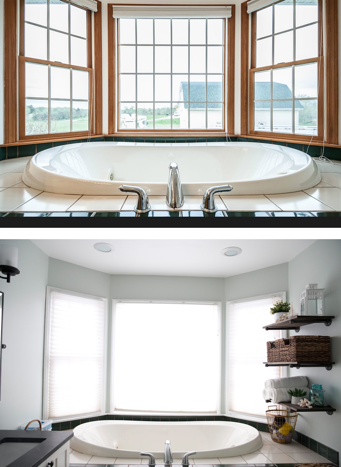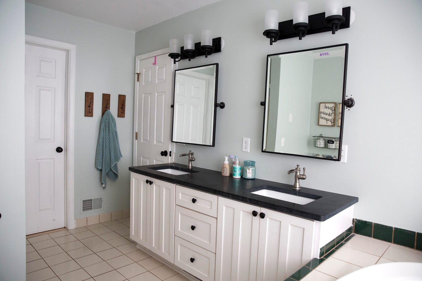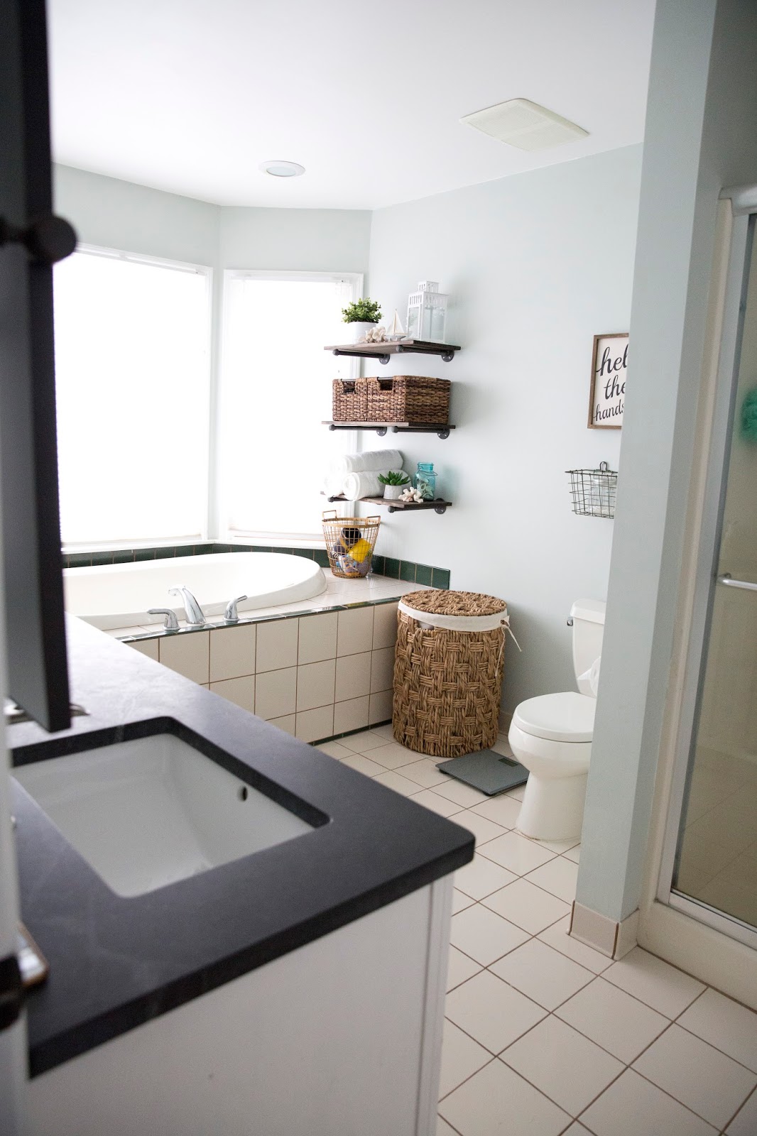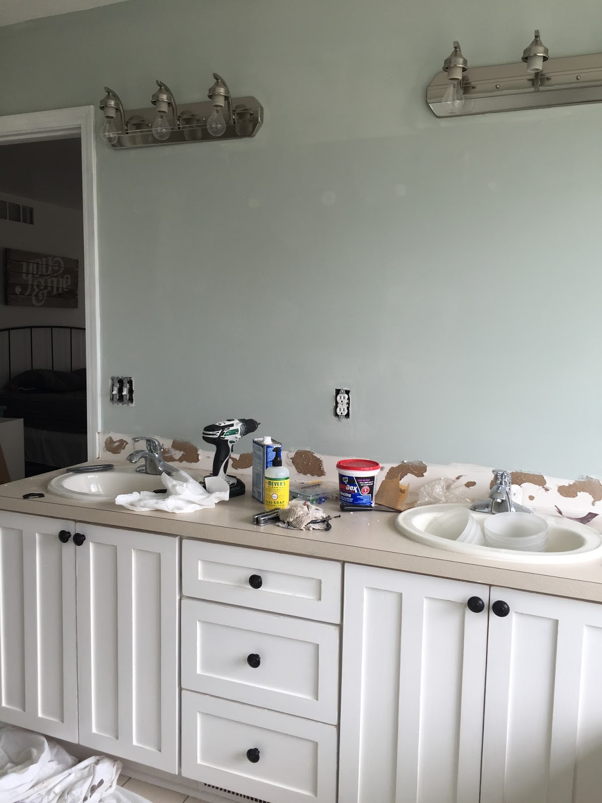 So, our master bathroom is a work in progress. I was tired of it looking SO dated, so we did a “phase 1” update. (mostly cosmetic, only removing countertops and mirrors as major reno parts). If you’d like to see some of my planning and inspiration, check out my Pinterest board: