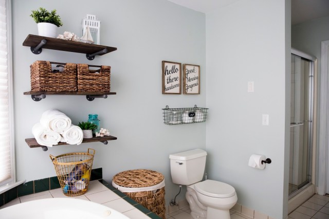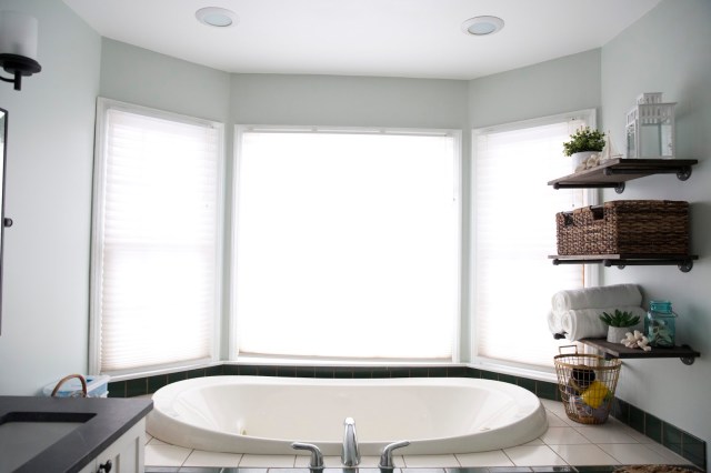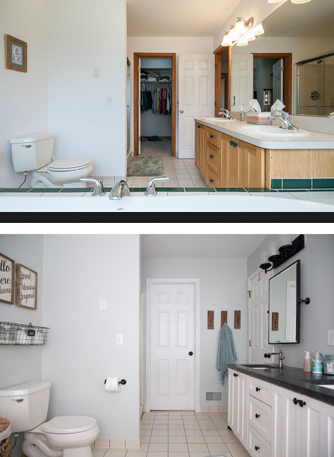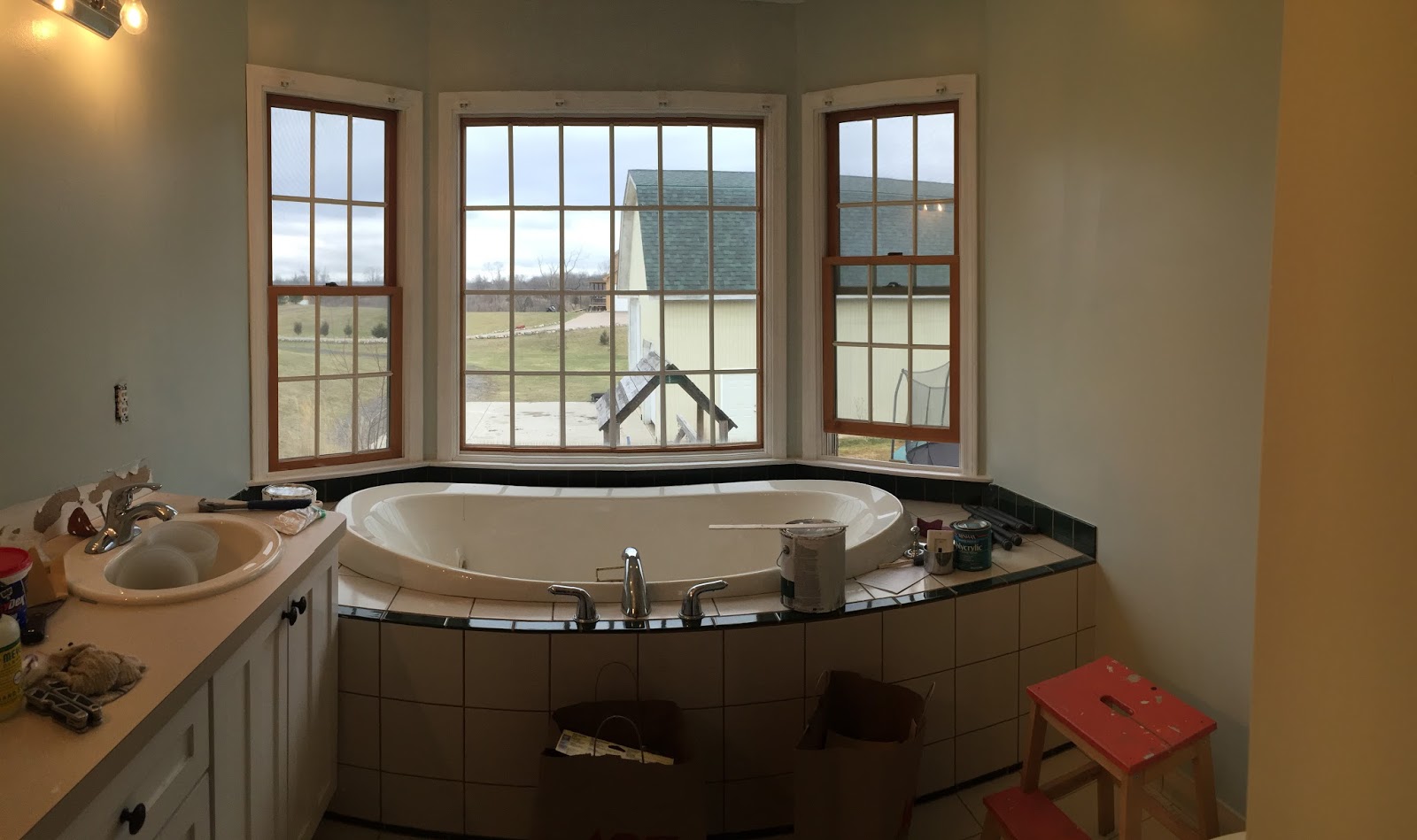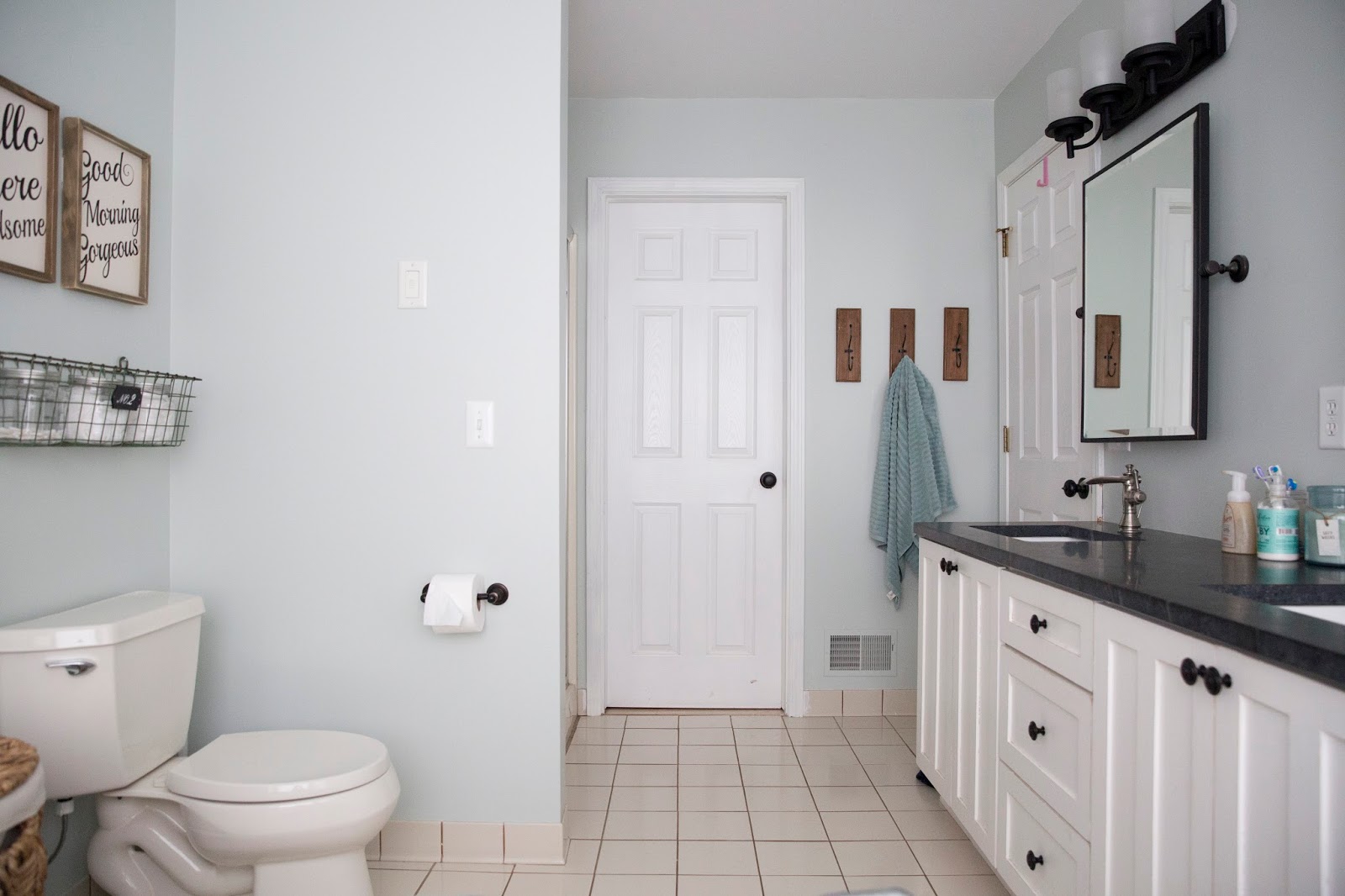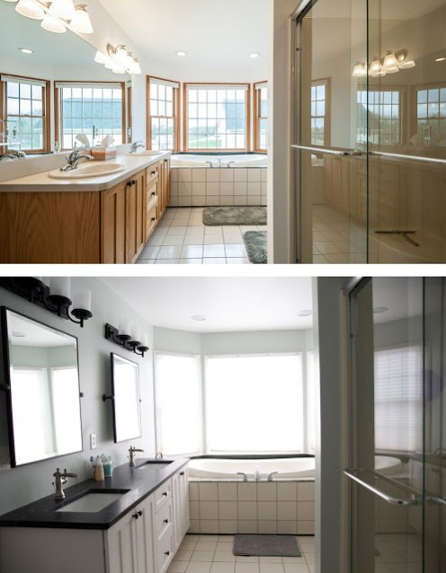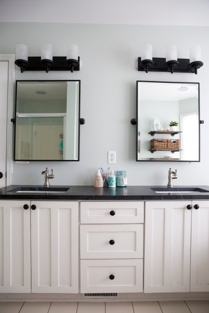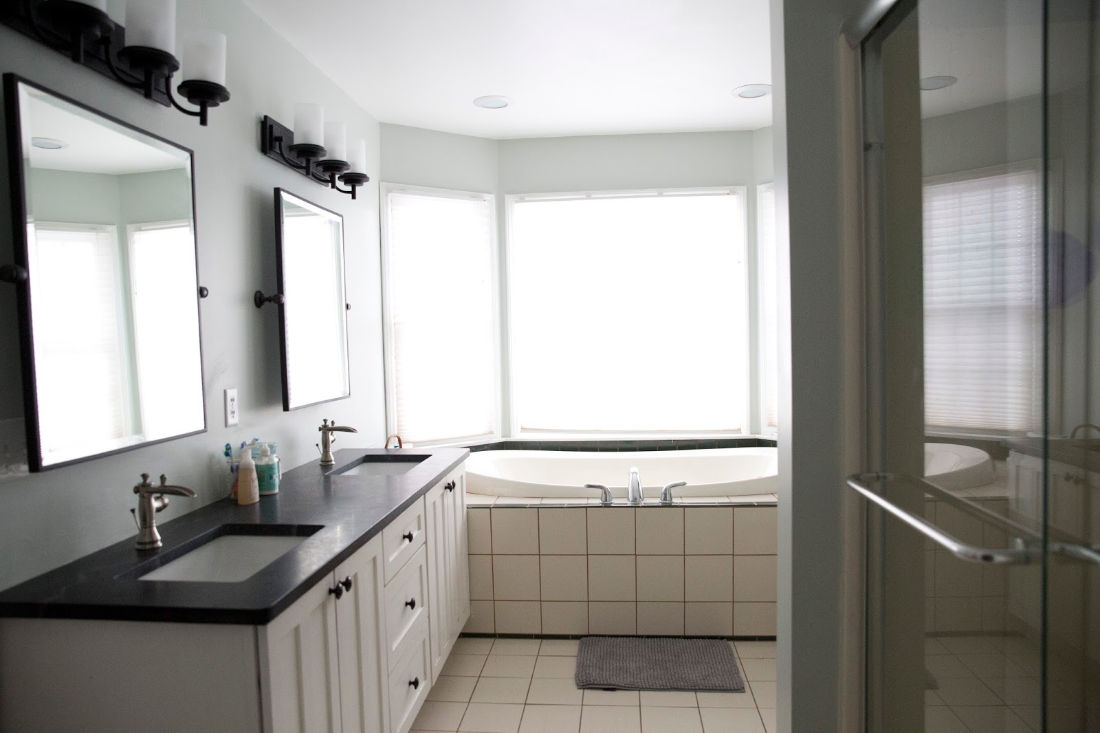 So, our master bathroom is a work in progress. I was tired of it looking SO dated, so we did a “phase 1” update. (mostly cosmetic, only removing countertops and mirrors as major reno parts). If you’d like to see some of my planning and inspiration, check out my Pinterest board: