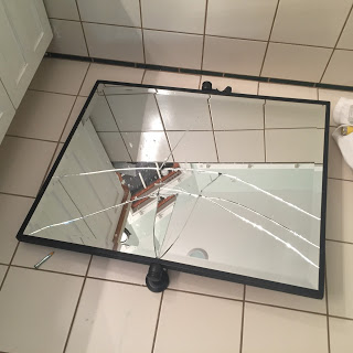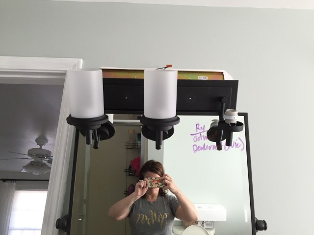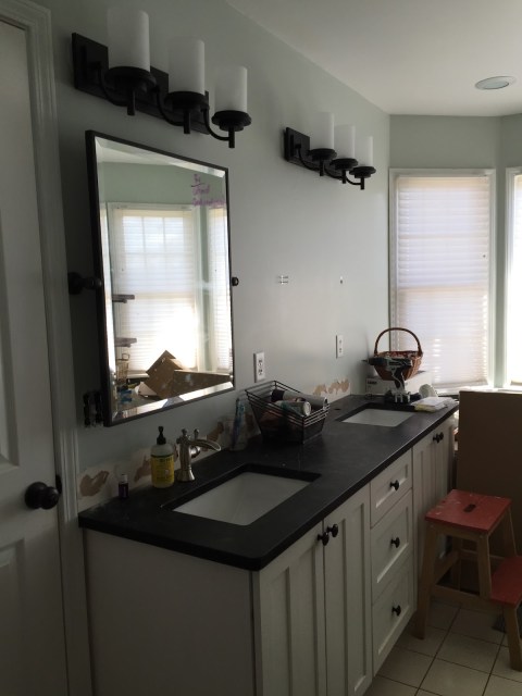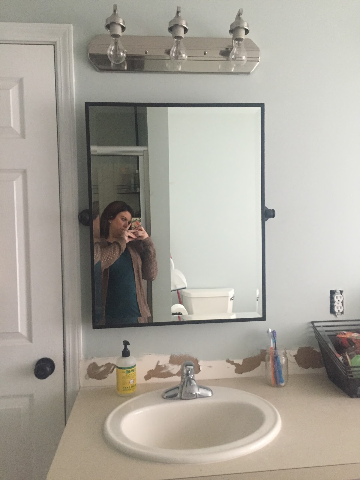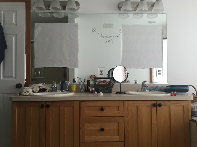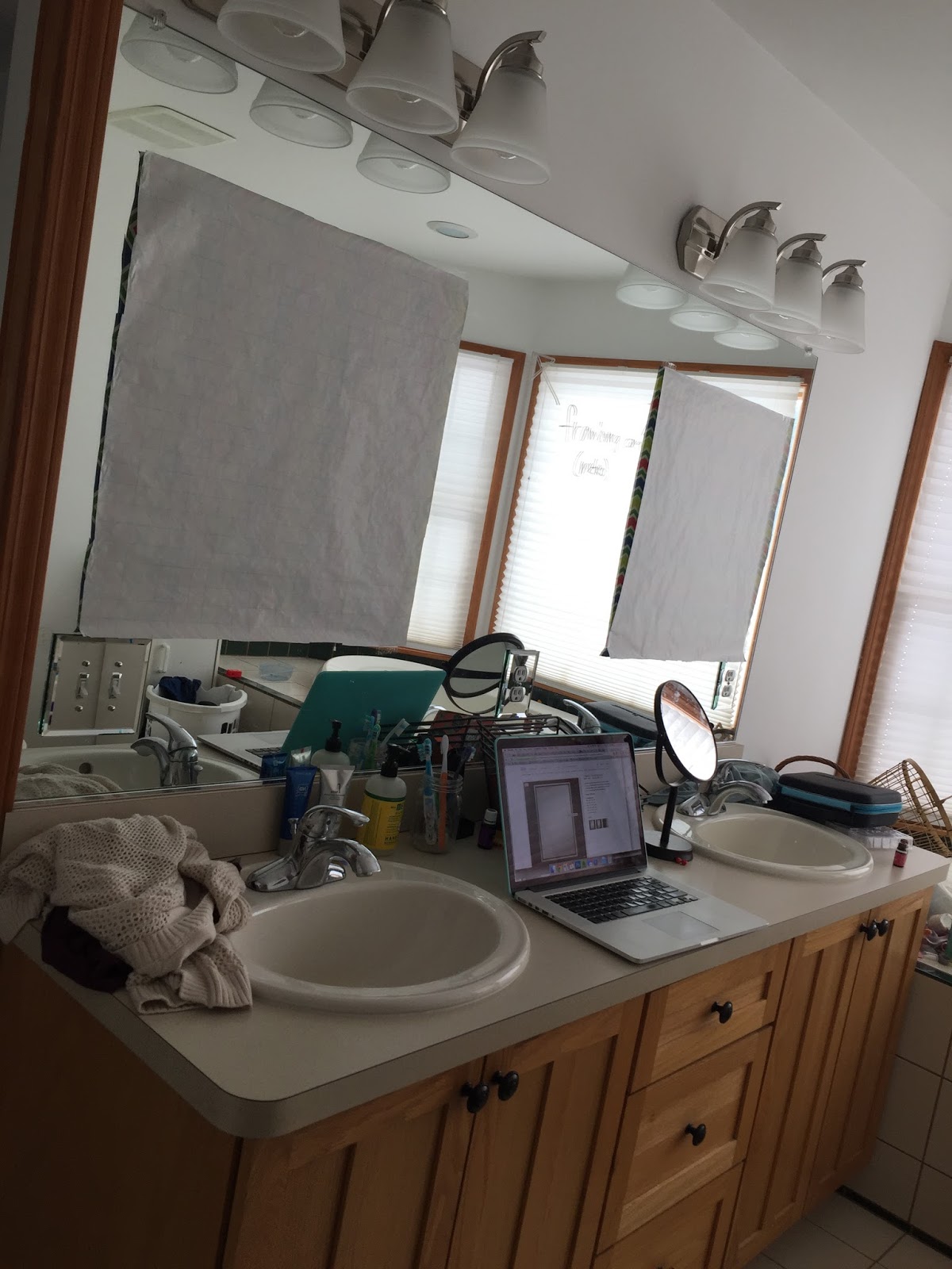 And, let’s walk through a bit of the updating. It started out with “let’s replace the mirrors”… (I wasn’t sure what size would be correct, so I tried out paper on the wall to get a visual)