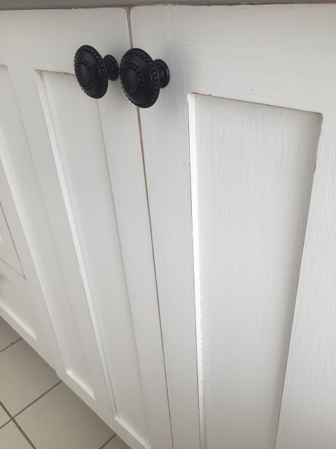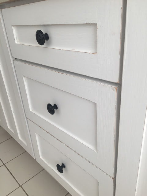 (Knobs are from Target, by the way) I distressed the cabinets because I wanted them to have a worn in, farmhouse feel. And because we have a million kids and “perfect” doesn’t stick around here for long. Painting… let me tell you. I think I did something wrong. I used white chalk paint and didn’t prime before (I feel like I’d read you DO NOT have to prime before?” Anyhow, I’m pretty sure I put on like 7 coats of paint. Ok… maybe more like 4 or 5. But a LOT. I did use BLACK chalk paint on the cabinet in our half bath (I’ll share that update later!) and it went on in 2 coats and covered like a CHAMP! This cabinet was my “tester” because I REALLY REALLY REALLY want to paint our kitchen cabinets and after the half bath painted over so easily I thought… let’s try white and then I’ll give the kitchen cabinets a go. Well. Our kitchen cabinets are still orangey-wood so that tells ya how scared I am of that project HA! I will, however, primer first should I attempt this again.