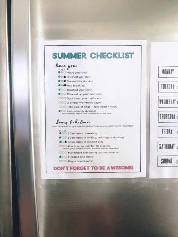 I’m not always the most consistent parent (please tell me I’m not alone in this) but I do love me some charts and systems. I loved the idea of a summer checklist where the kids get the basics done everyday and can earn some much desired tech time… so I compiled some lists from Pinterest and laminated it and the kids have been doing (mostly) a great job at completing my non-negotiables before asking for electronics (which is still a limited time per day… we don’t do unlimited tech time. Ever. And the kids’ iPods have passwords that only we know). This hangs on our fridge next to our “3 strikes” sheet that I created after Kendall introduced this to the kids while we were in Utah. .