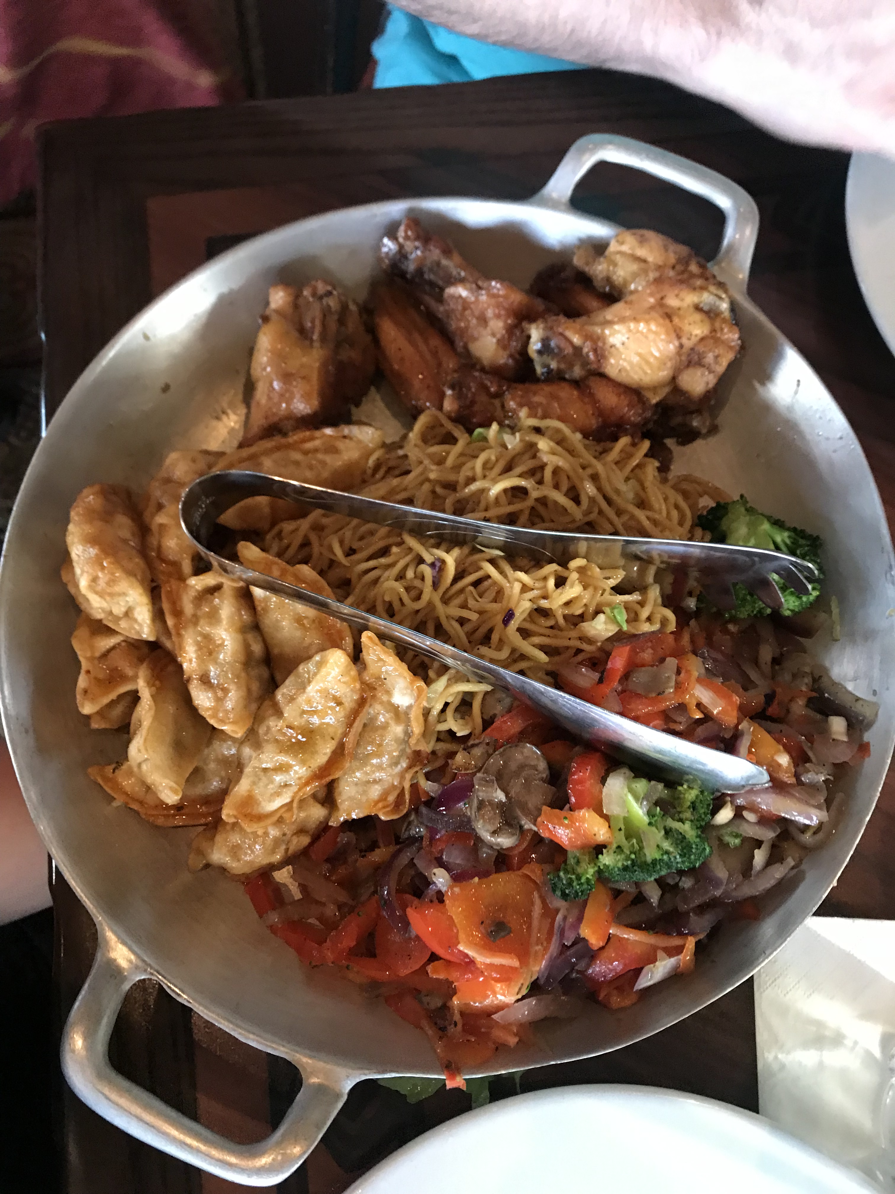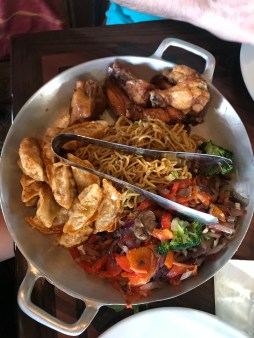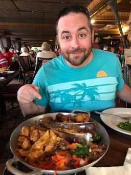 Our MUST DO at Disney- every trip- is to eat at Ohana. Our favorite meal is dinner by far. Pot stickers, noodles, veggies, chicken and pork skewers, and the most delicious bread pudding and ice cream for dessert! MMMM! Dinner does not have characters, but breakfast does! At dinner they do a fun coconut + broom race with the kids which is pretty cute.