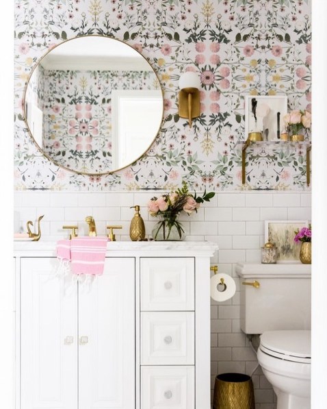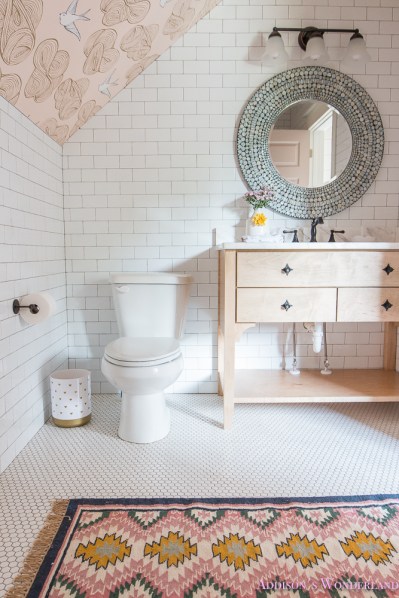 This first bathroom up top is from At Home with Ashley and I adore the girly feel of it.  From the beginning, I’ve pictured a subway tile wall about half to 2/3 high and then a fun wallpaper above for the girls’ bathroom. I love the gold fixtures and the round mirror. All things on my vision board for this room.