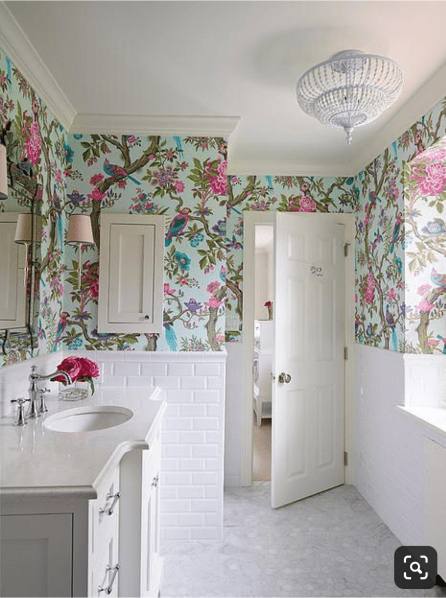 Actually…this picture was my first inspiration pic for the girls’ bathroom.   It’s a little more… uhmmm… victorian/formal? than my style but I do love the bright bold colors in contrast to the gold and stark white!