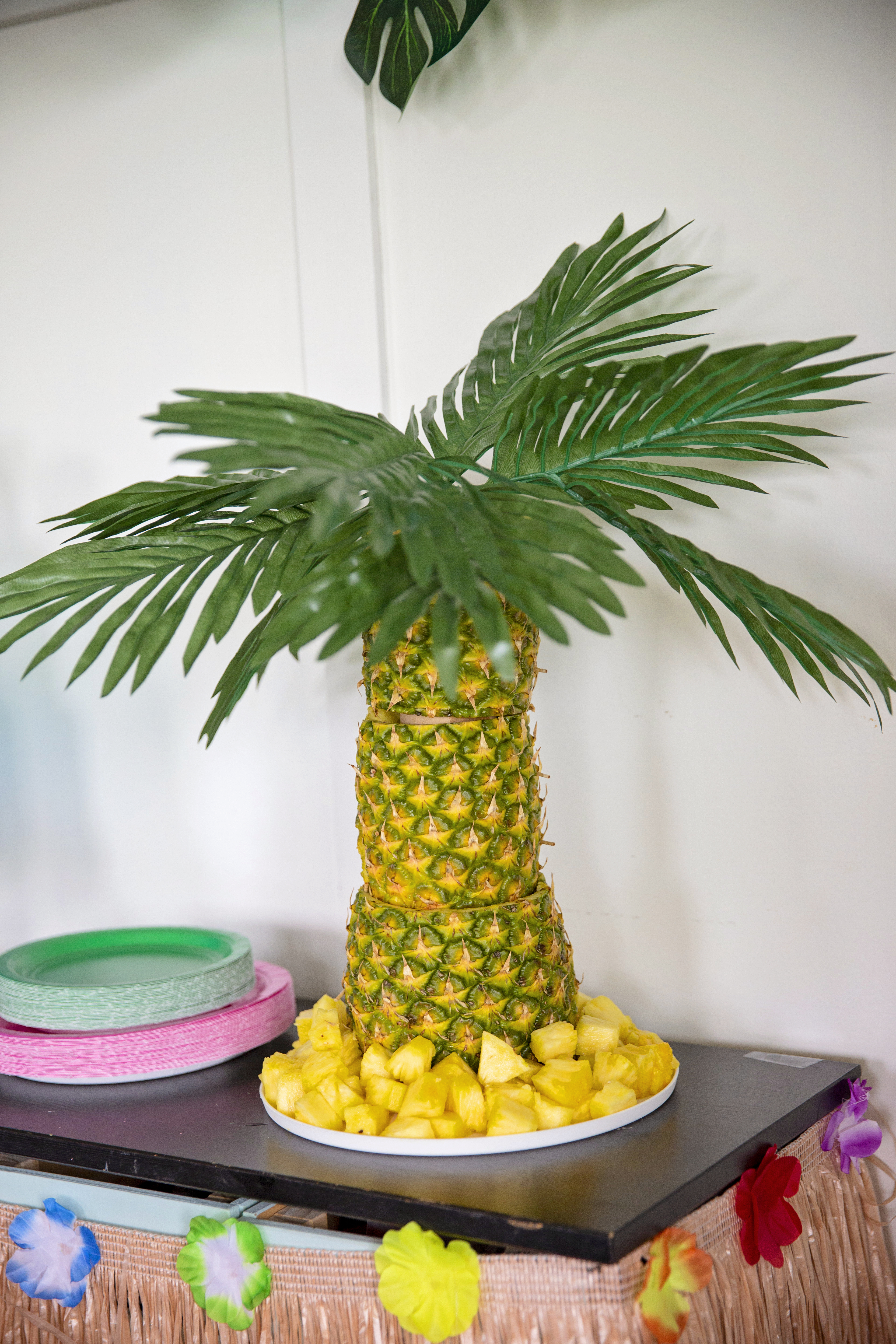 The pineapple palm tree… ohhh boy that was an interesting project! I saw the idea on Pinterest, and it was slightly more difficult to put together than I’d imagined. The grocery store cut the pineapples in half, so we had to “toothpick” them back together. I used more leaves from Amazon (see above) to stick in the top. The pineapples are actually around some cardboard tubes from Young Living supplements… it was the perfect size.